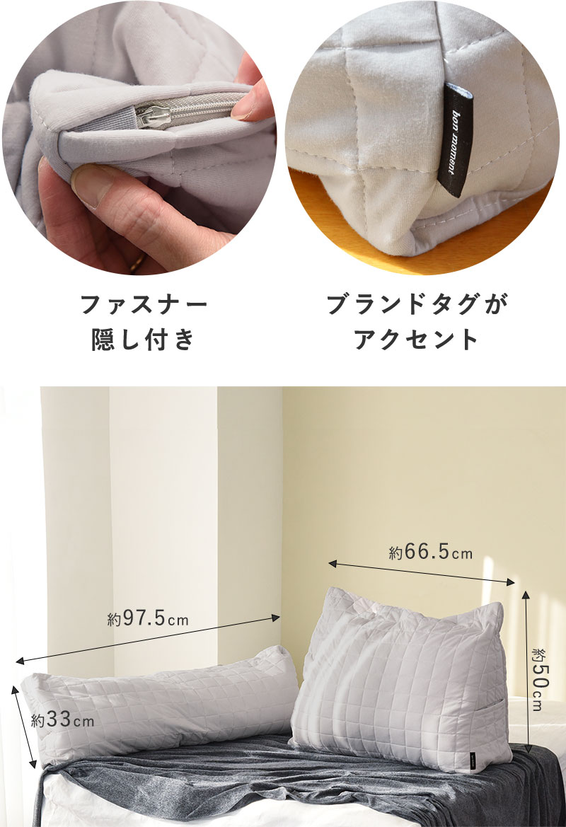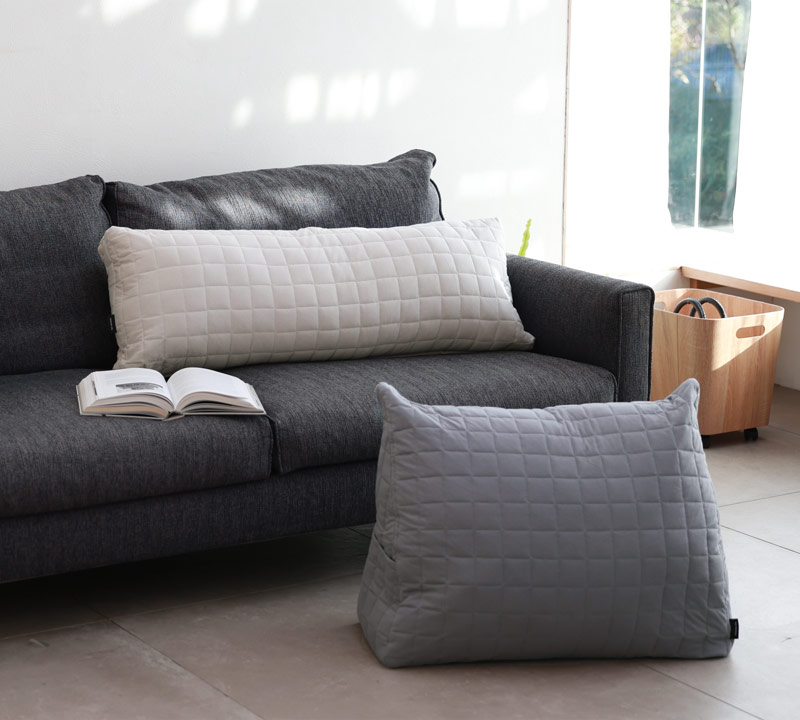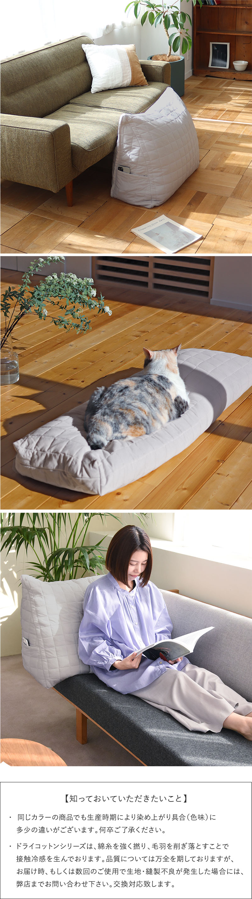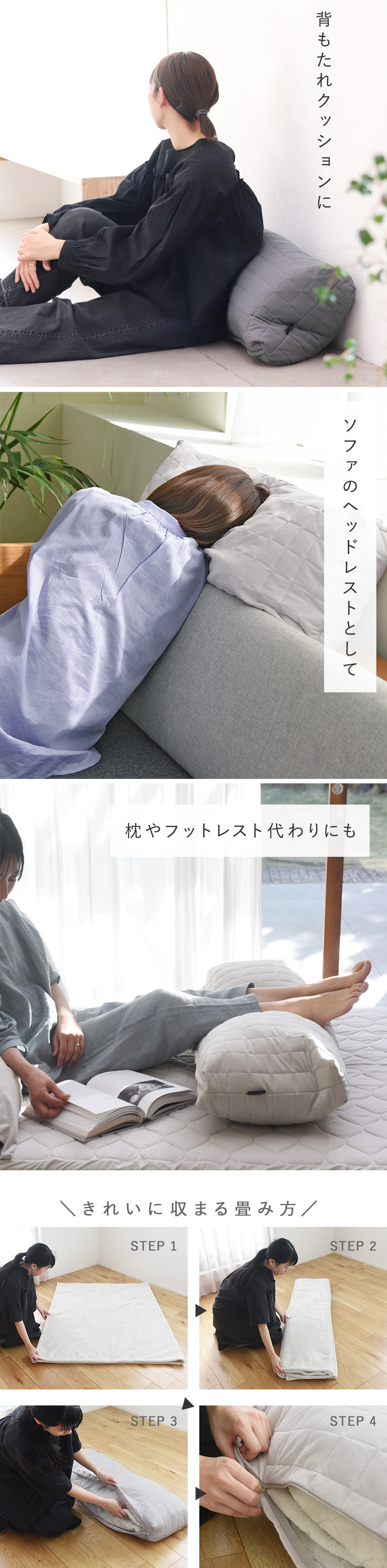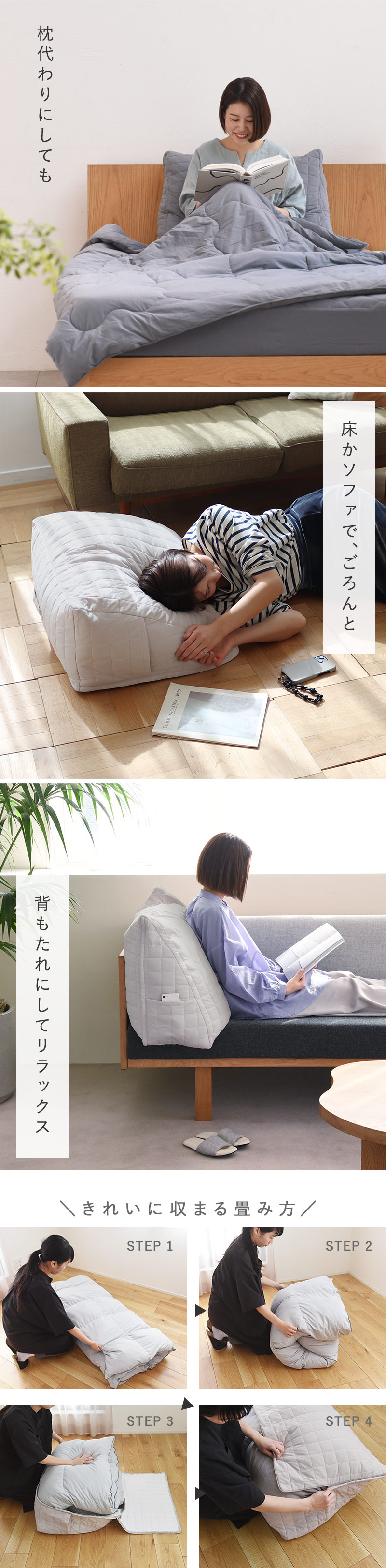 ■ まくらになる、ロング型抱き枕感覚で使えるロング型。ベッドの上で枕にしても、フットレストとして使うのもよし。さらに、ソファー上に置いたり、もちろん床置きも◎。