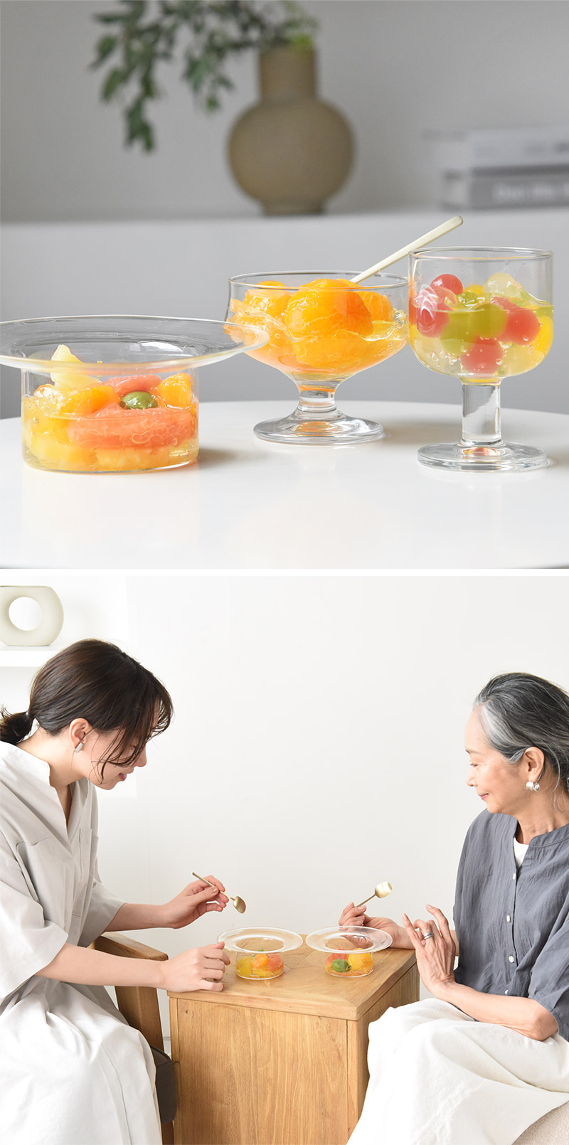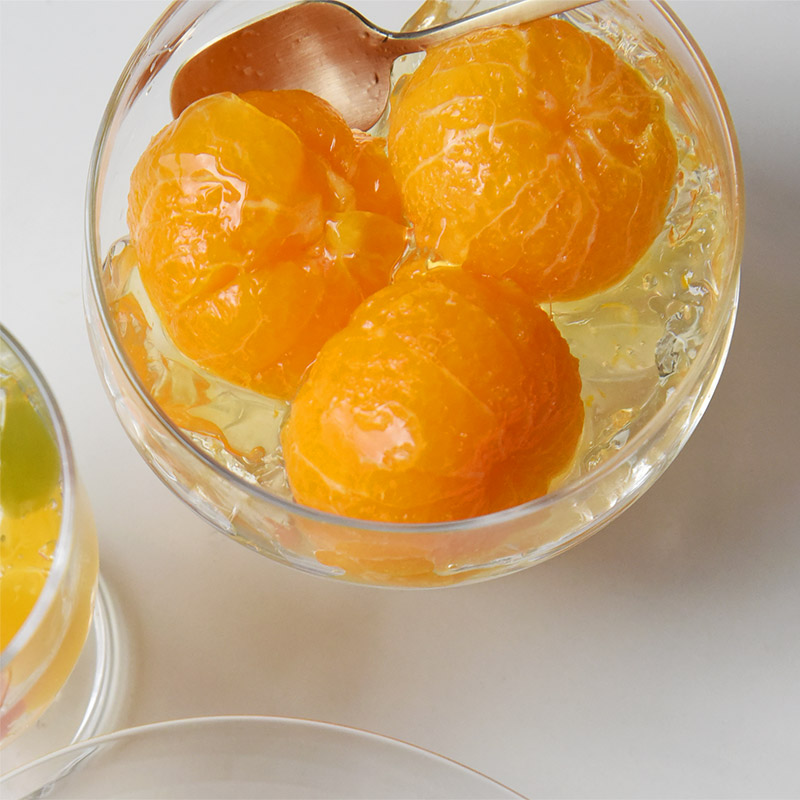 「フルーツコンポート/ゼリーボール/みかんコンポート」は全て、最後の1滴までお楽しみいただけるように、シロップではなく、上品な甘さの「ジュレ」で果実を閉じ込めています。器に盛った時も、キラキラと輝いて、見た目の美しさにも目を奪われます。