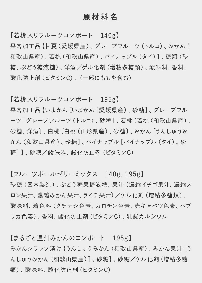 3個セット:全種類楽しみたい方に「1.若桃入りフルーツコンポート(195g)」「2.フルーツボールゼリーミックス(195g)」「3.まるごと温州みかんのコンポート(195g)」が各1瓶ずつ入ったセット。3種類ともまるっと楽しみたい方にぴったりです。