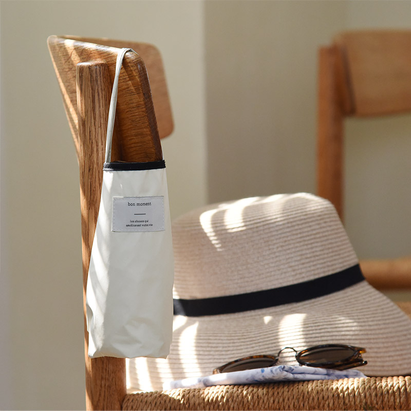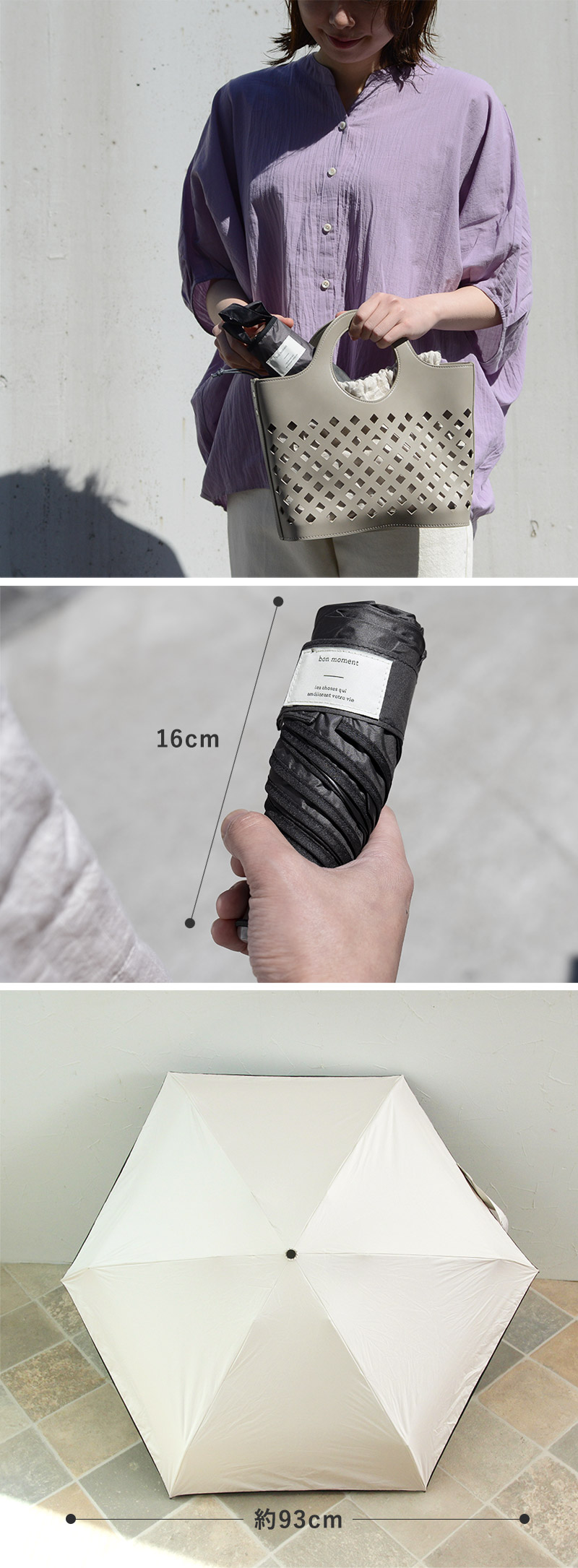 畳むとミニバッグにもすっぽり収まり、持ち歩きにもノンストレスな軽さ。小さいけれど、高い撥水力に加え遮光率&UVカット率は“ほぼ100%”という機能派です。