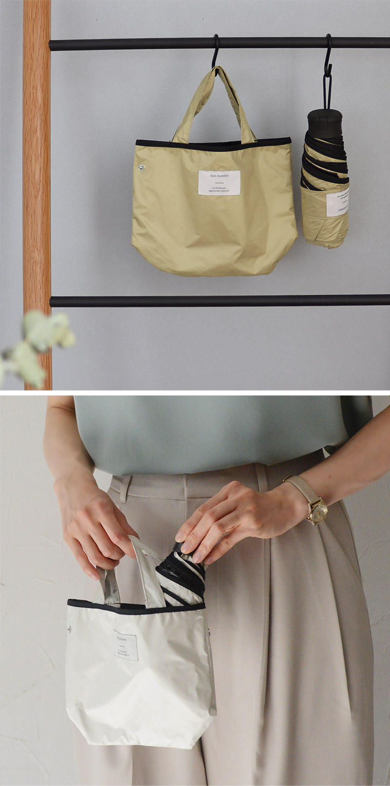 余裕のあるサイズ感なので、電車に乗る時や、急いでいる時はしっかり畳まなくてOK、スポッと入れられます。傘生地を使った3重仕様の素材で水も染みません。