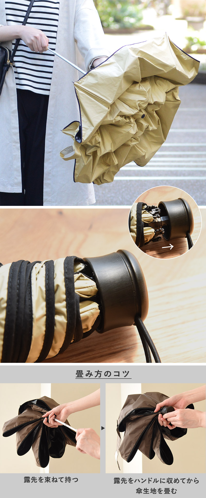 露先がハンドルの中に深くしっかりはまる仕様。露先を収めてから、傘生地の角を整えてバンドを巻けば、キレイに畳むことができます。