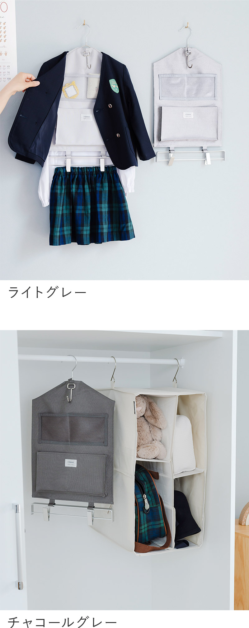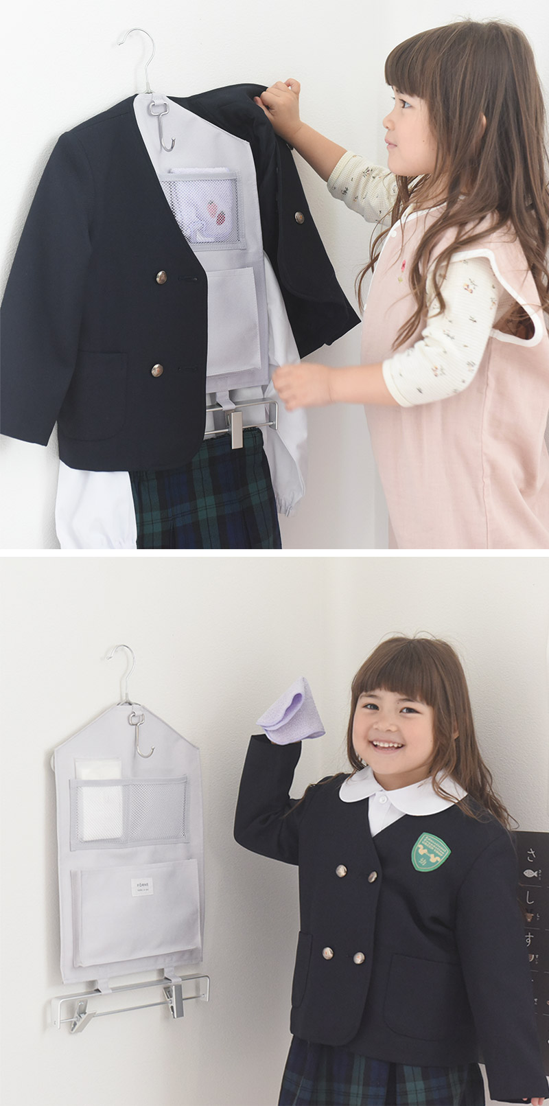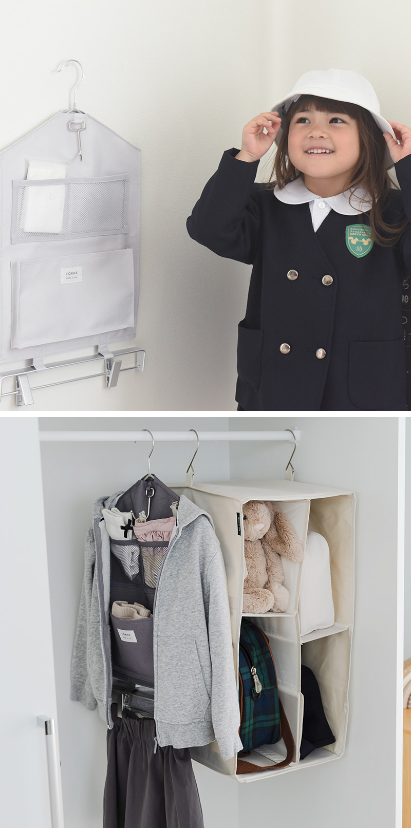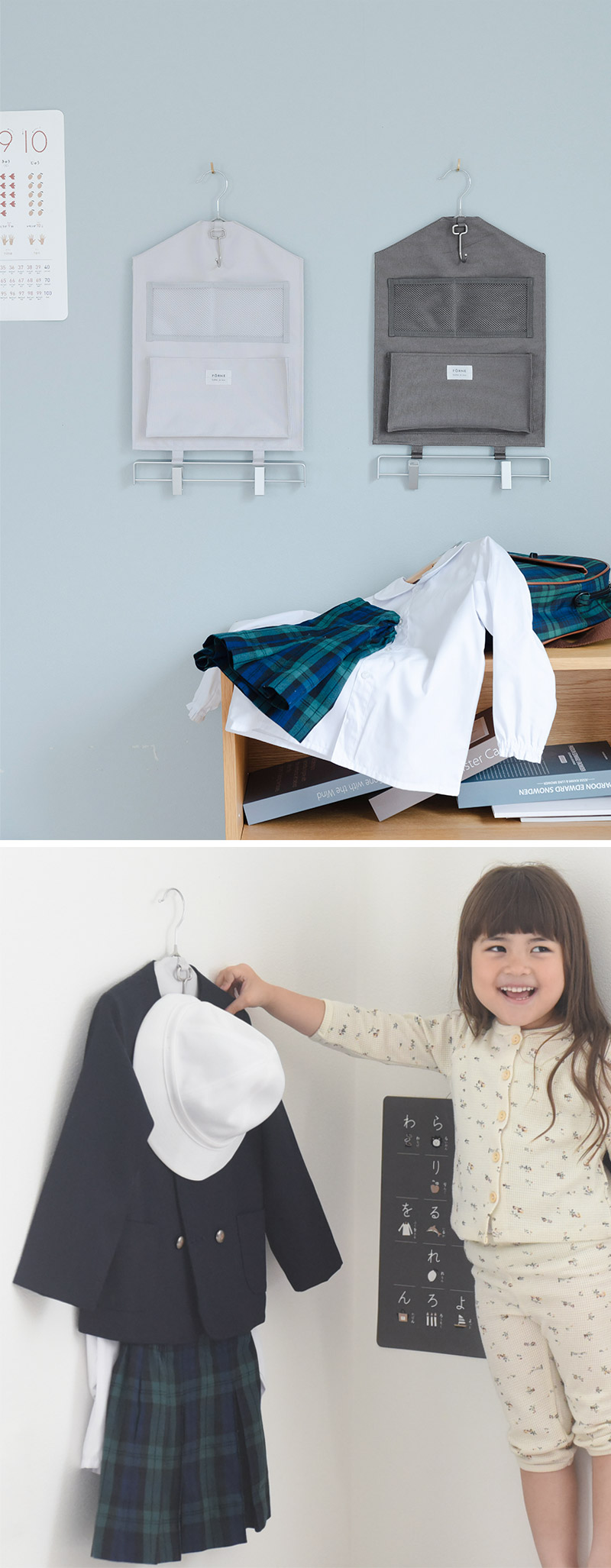 気楽にお使いいただけるよう、お手持ちのキッズハンガーに取り付けられる仕様に。さらに、上着・ブラウス・ボトムスを一緒にかけておけて、帽子やバッグ、靴下など散らかりがちなモノも、ひとまとめにできるようにしました。