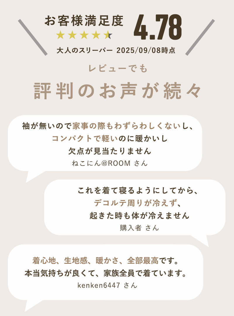 冷えやすい肩周りをしっかりカバーベストのようなデザインで、動きやすさをキープしつつ、布団から出て冷えやすい肩周りを暖めます。