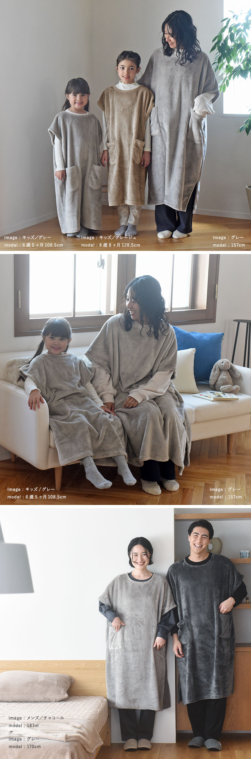 レディース、メンズサイズに加えてキッズサイズもあるので、夫婦や親子お揃いでも着られます。身長や体格によってはパートナーと兼用しても。