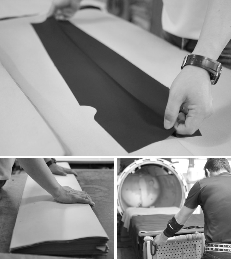 通常のアイロンのプレスとは異なり、熱処理、スチーム吹付け、真空状態を繰り返すことで高いレベルで形状記憶させる特殊な加工。