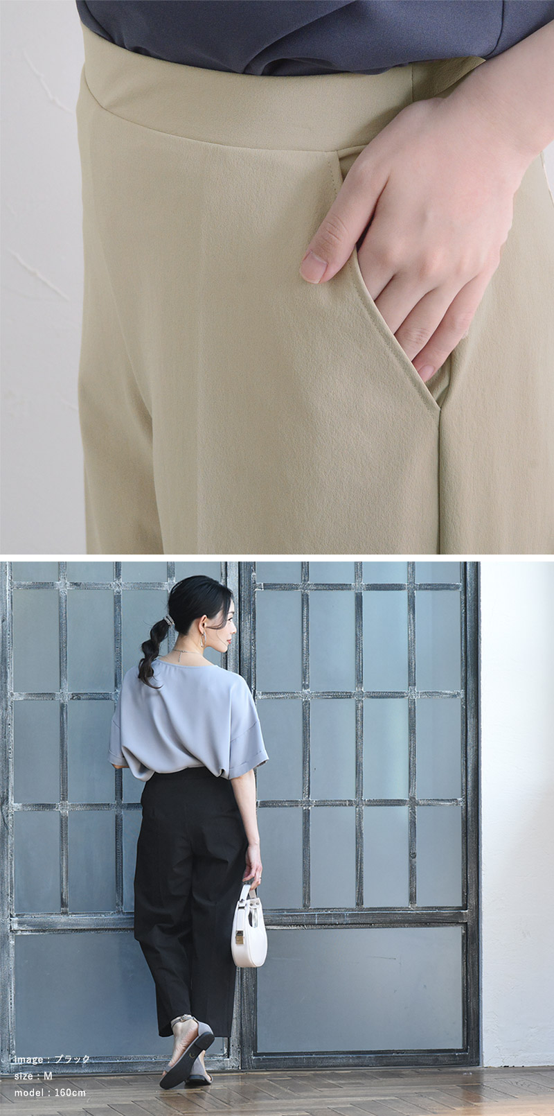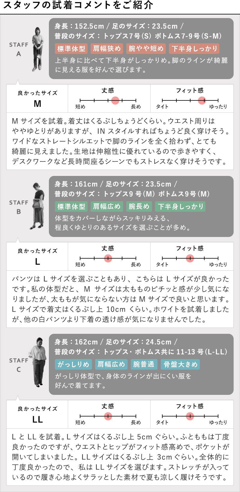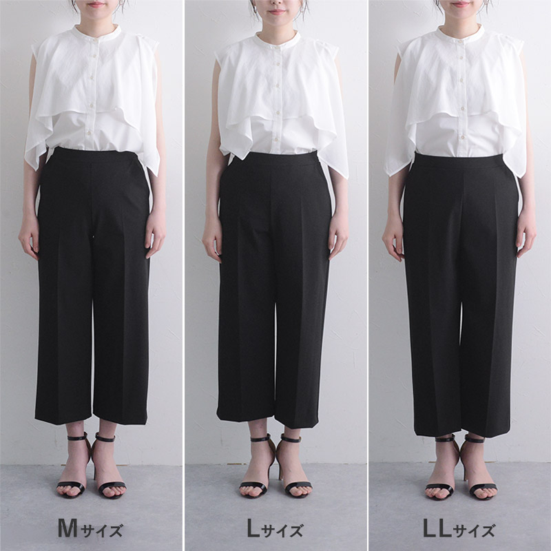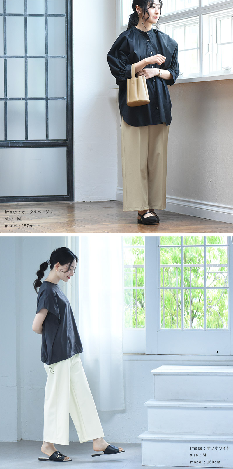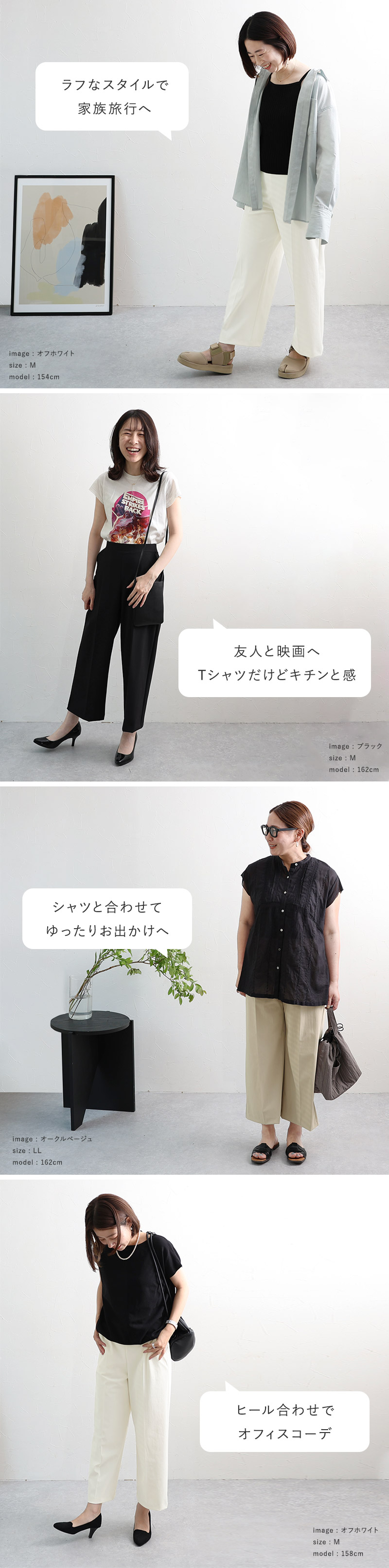 アンクル丈のワイドシルエットは、脚さばきが良く、風通しも良いので夏にぴったり。短めの丈なので、小柄な方でもバランス良く着こなせます。