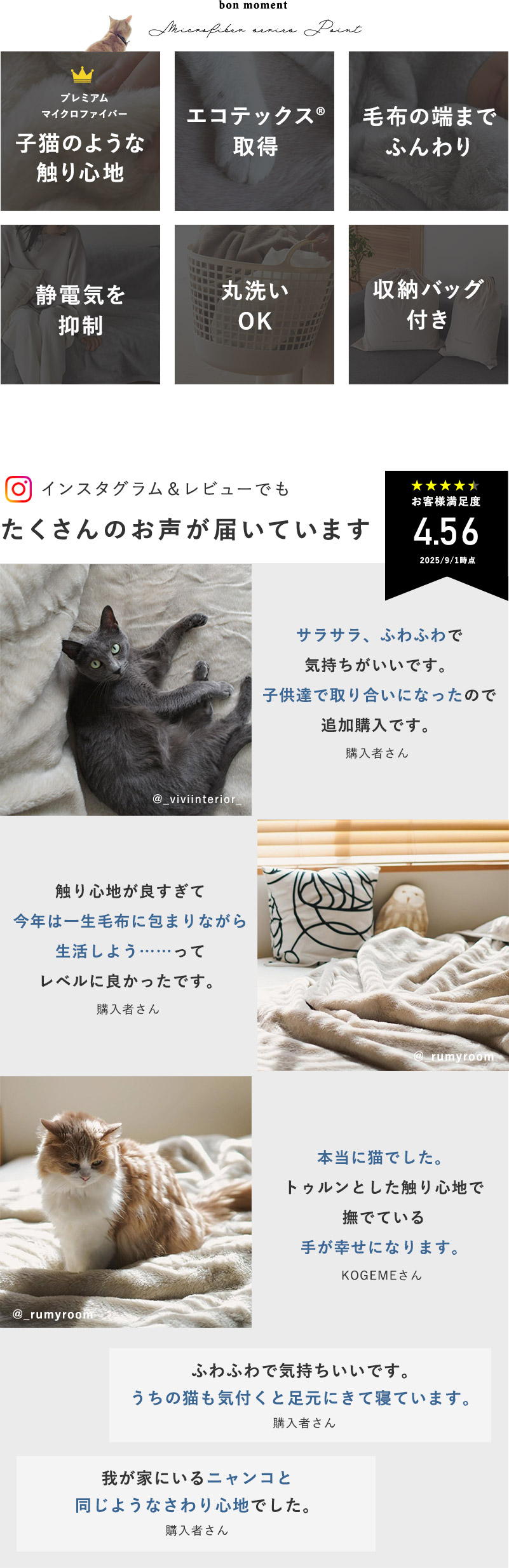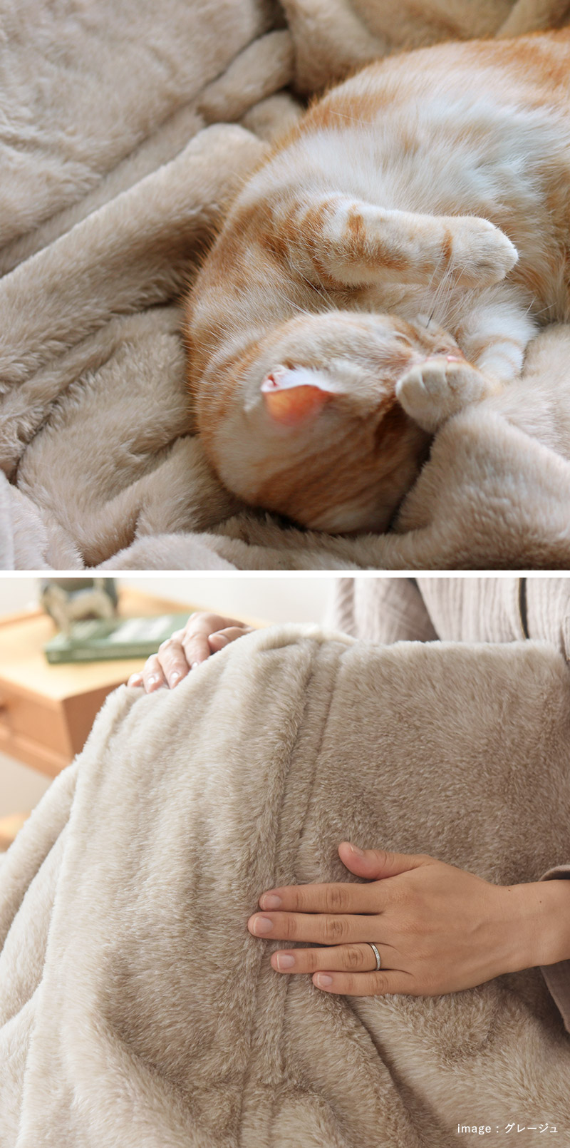 まるで子猫をなでているかのような癒しの肌触りで、ベッドに敷けばもはや猫の沼。毛布に包まれるとほわっと温かく、なかなか抜け出せなくなるヤミツキ毛布です。