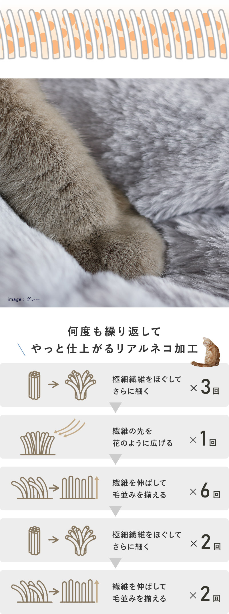 猫の毛並みを追求した繊維一般的なマイクロファイバーに比べてやや太めの繊維。手触りをより猫に近づけるためにこの太さをセレクトしました。滑らか&柔らかな質感は保ちつつ、弾力のある肌触りも実現。毛玉にもなりにくく、極上な感触がずっと続きます。