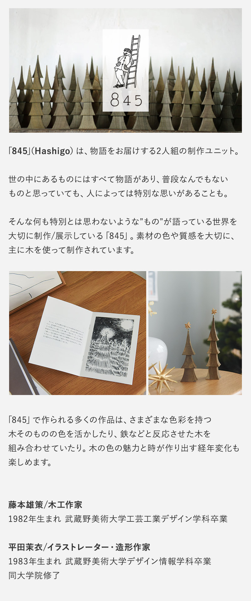 冬のすみきった空気や深い森、えっさほいさと冬支度するどうぶつたち。まっすぐに伸びるツリーから、そんな光景に想像を膨らませる「845」(Hashigo)の作品。