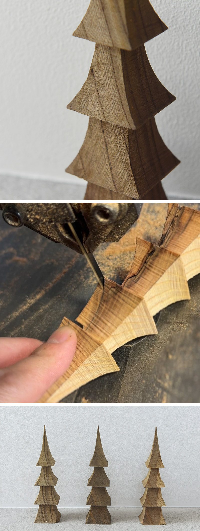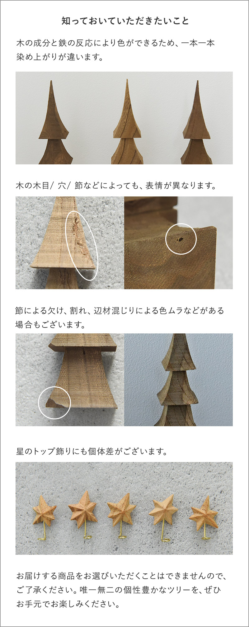 ケヤキ材を一本一本ツリー型に切り出し、鉄を反応をさせて染められています。木の成分と鉄が反応することで、さまざまな色に変化。同じ種類の木でも含まれる成分が異なるため、染め上がりも一点一点違う味わいに。時間とともに変化する経年変化もお楽しみいただけます。