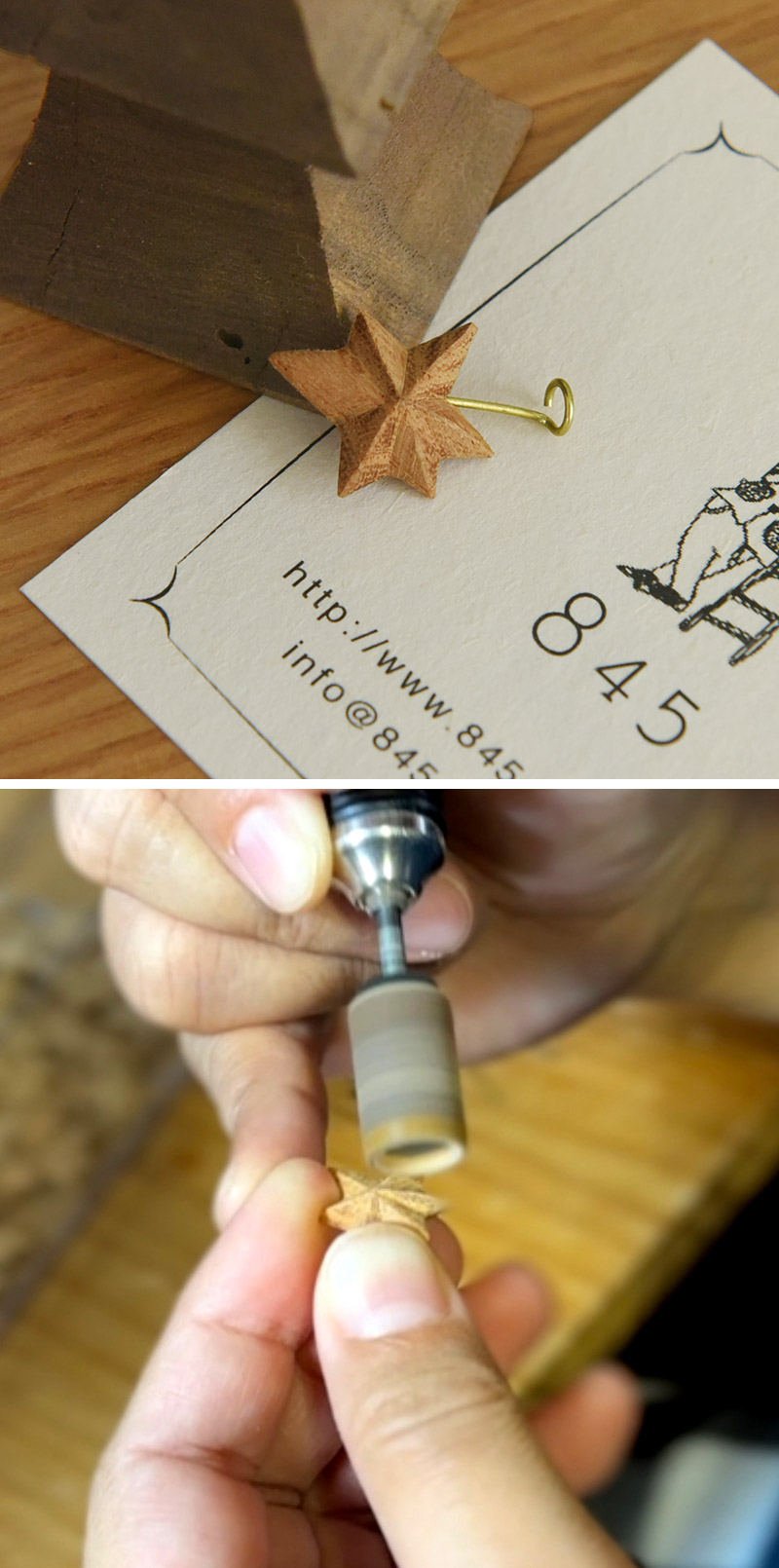 『物語を届ける制作ユニット「845」』から誕生したこちらは、建築材から出る端材(はざい)で作られたクリスマスツリー(4段)。限られた資源を、ひとつひとつ丁寧に手作業で作り上げています。