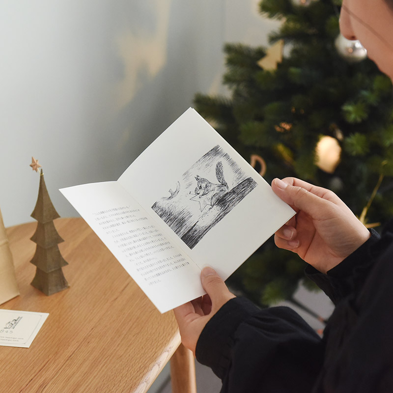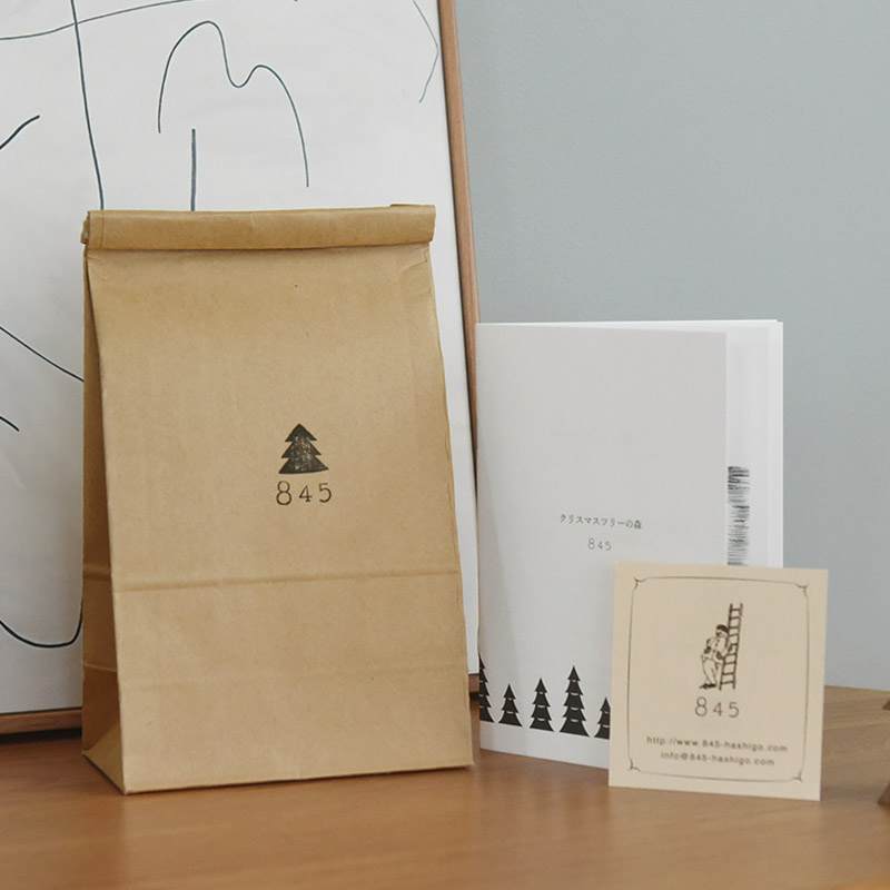 845のロゴとツリーがあしらわれた紙袋に入れてお届けします。ツリーと一緒にブランドカードと、<クリスマスツリーの森>のショートストーリーの小冊子も。