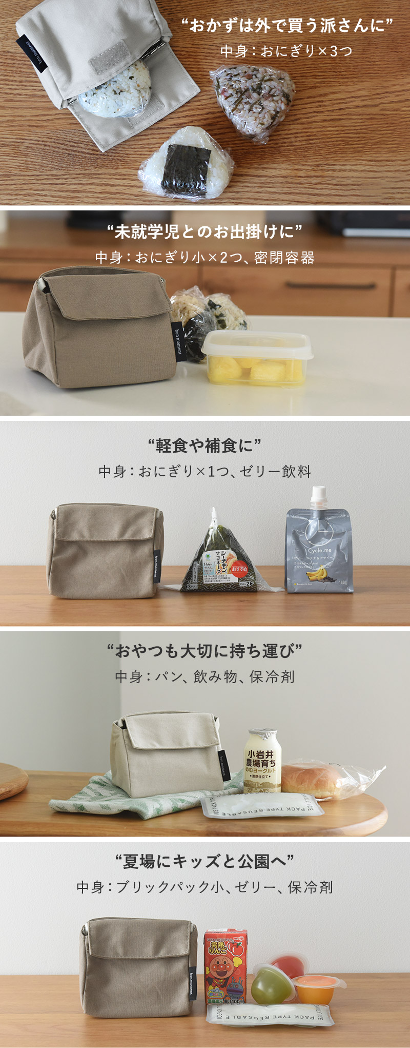 手の平にちょこんと乗るくらいのサイズ感なので、バッグの中でもかさばりません。だからおにぎりはもちろん、小さめ保存容器、ゼリー飲料の持ち歩きにと小回り抜群。