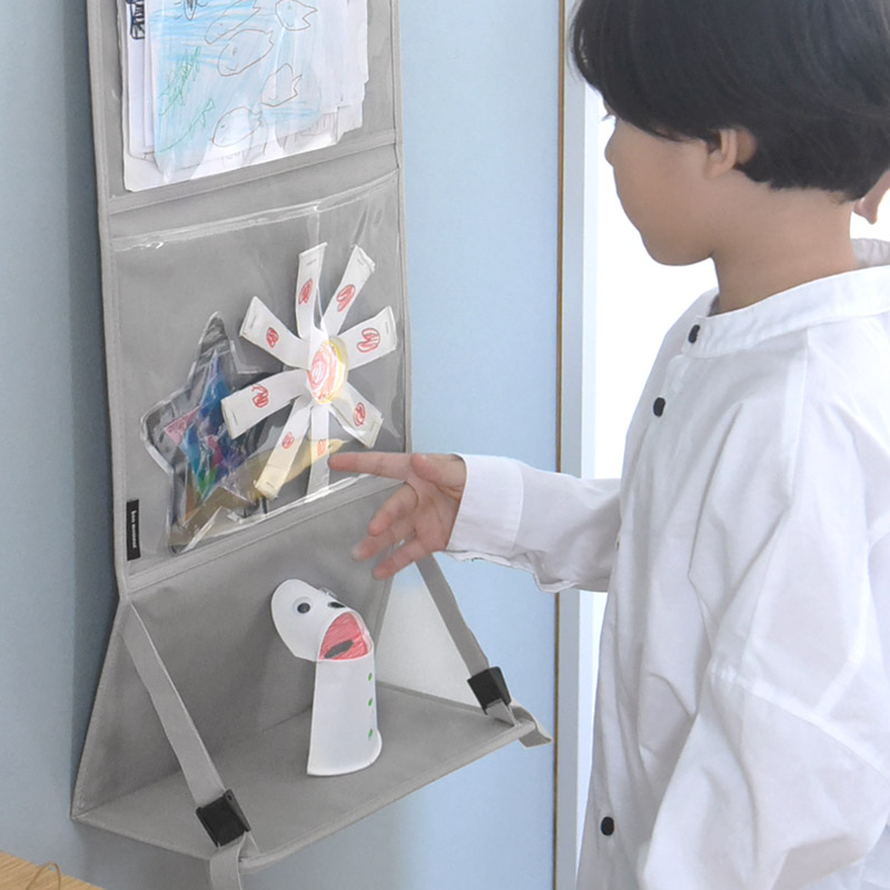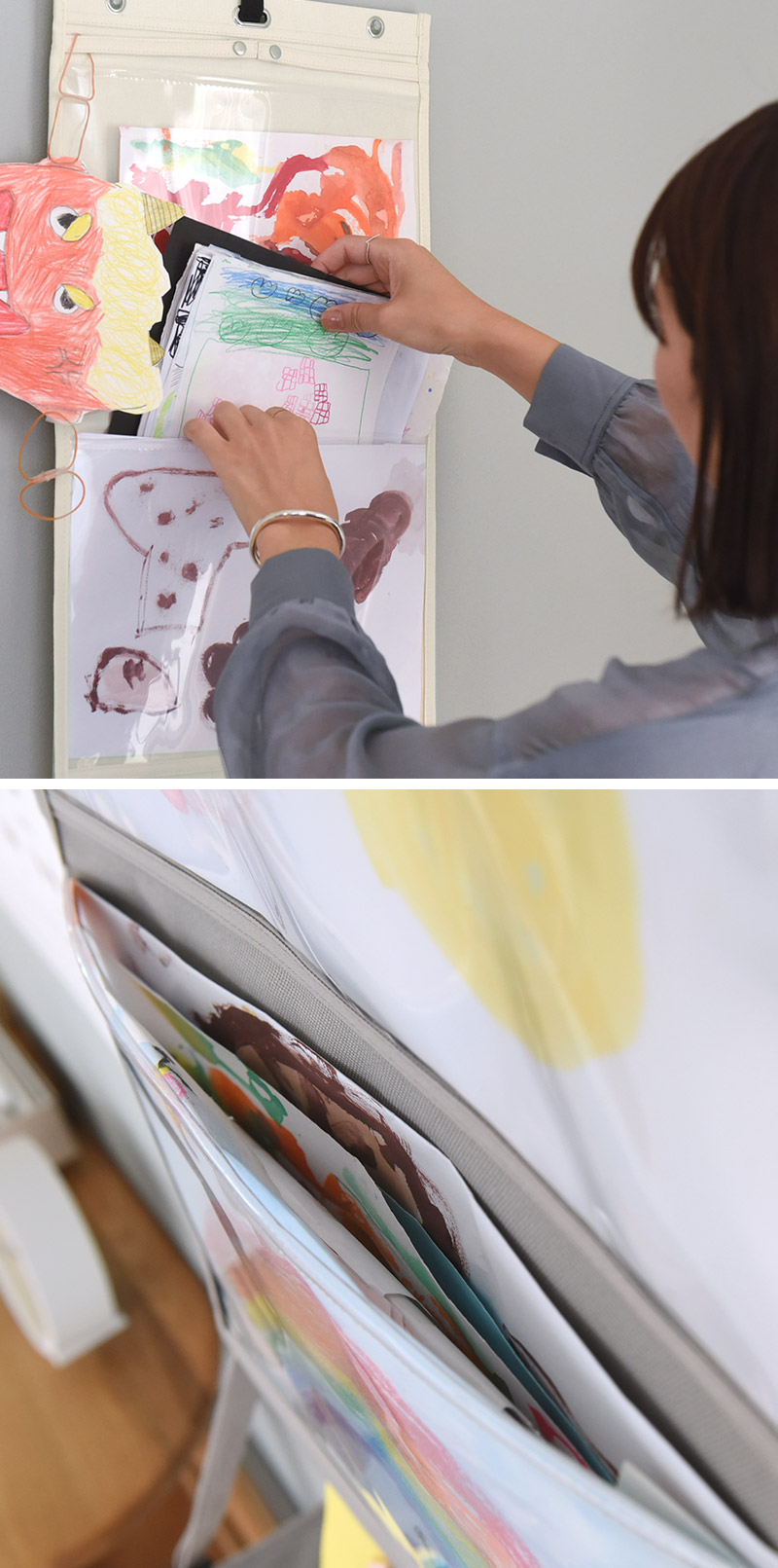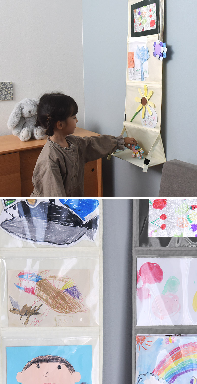 クリアポケットが3つ付いており、A4サイズまでの絵画を収納ができます。ずらりと並べれば、こどもたちのミュージアム完成です。