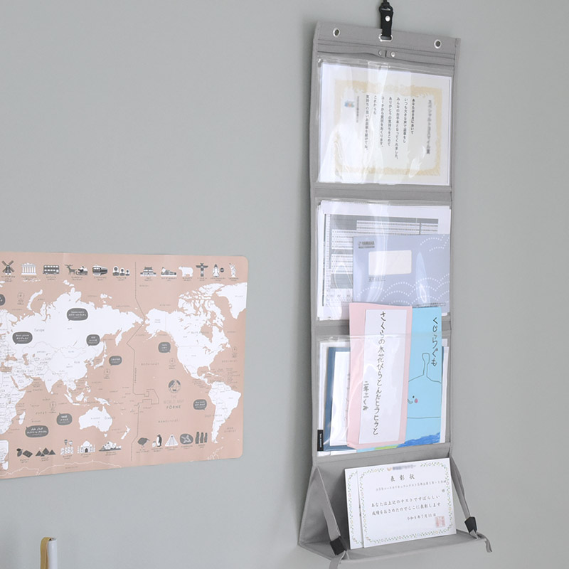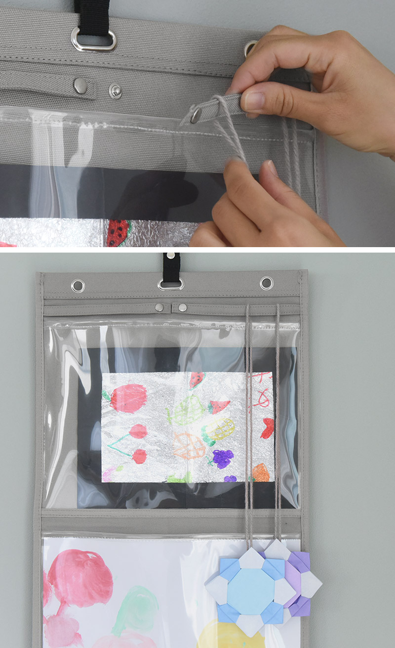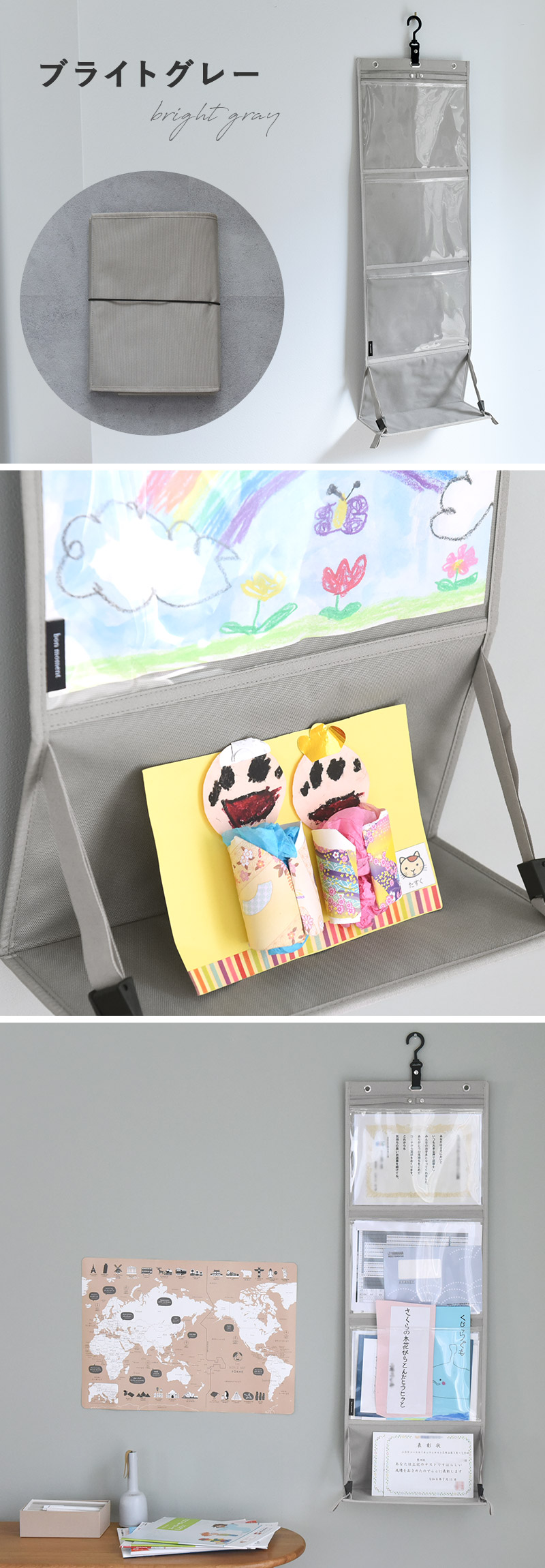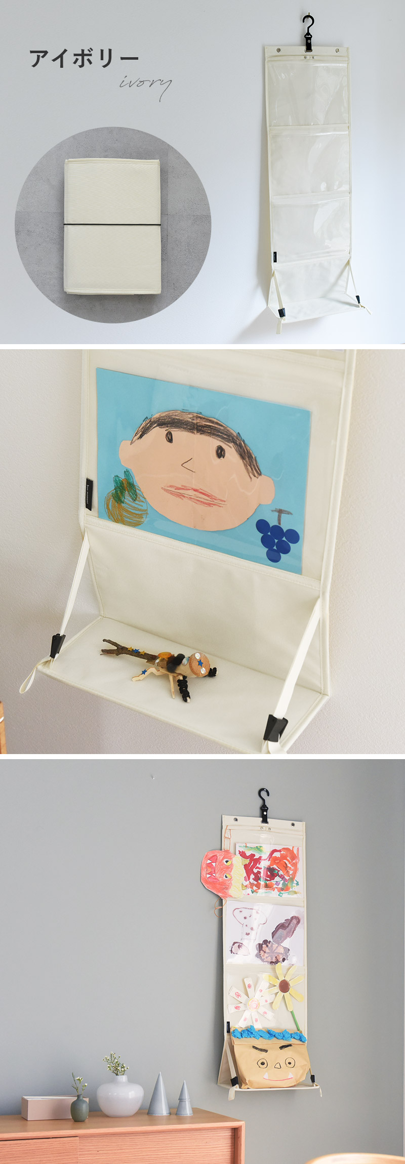 クリアポケットが3つ付いており、A4サイズまでの絵画を収納ができます。ずらりと並べれば、こどもたちのミュージアム完成です。