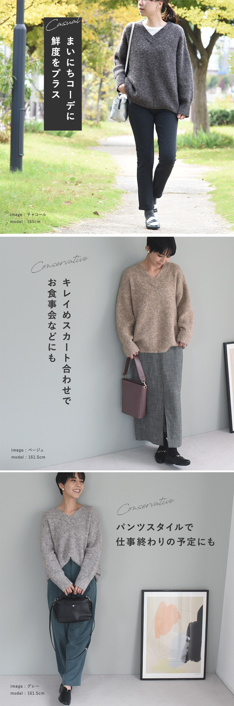 首元が開きすぎないVネックデザインで、すっきり見えと暖かさを両立しています。太めのリブが程よいカジュアル感を演出し、Vの頂点が重なるデザインもポイントに。