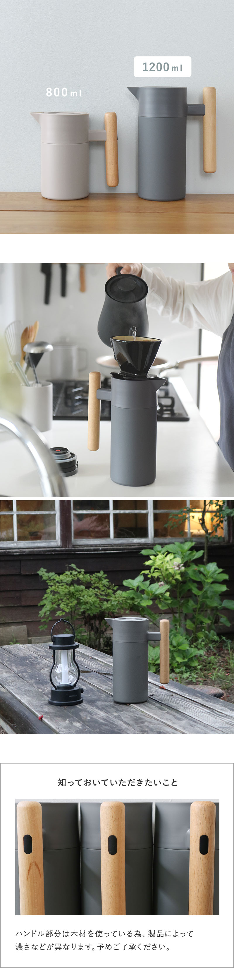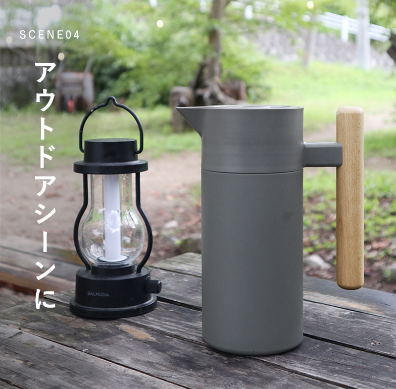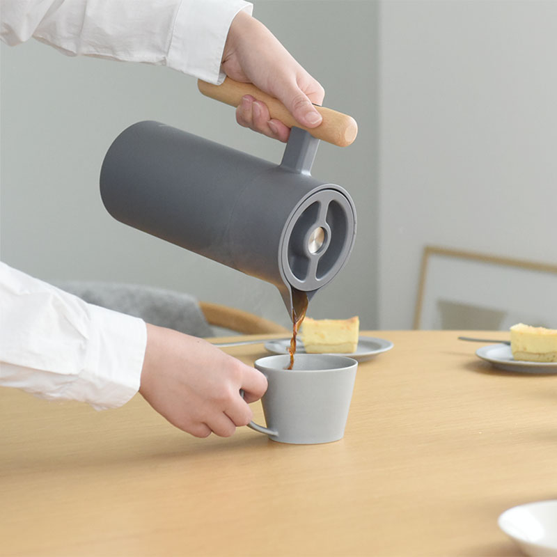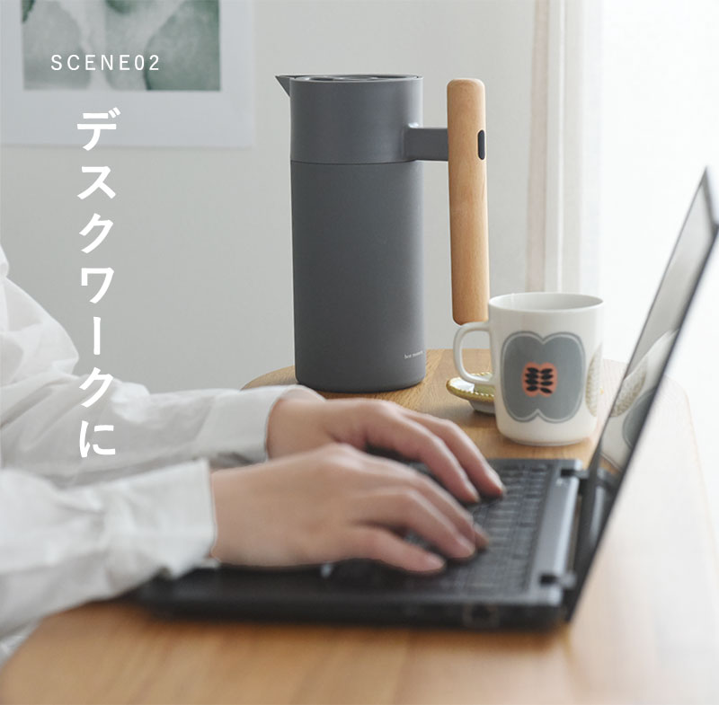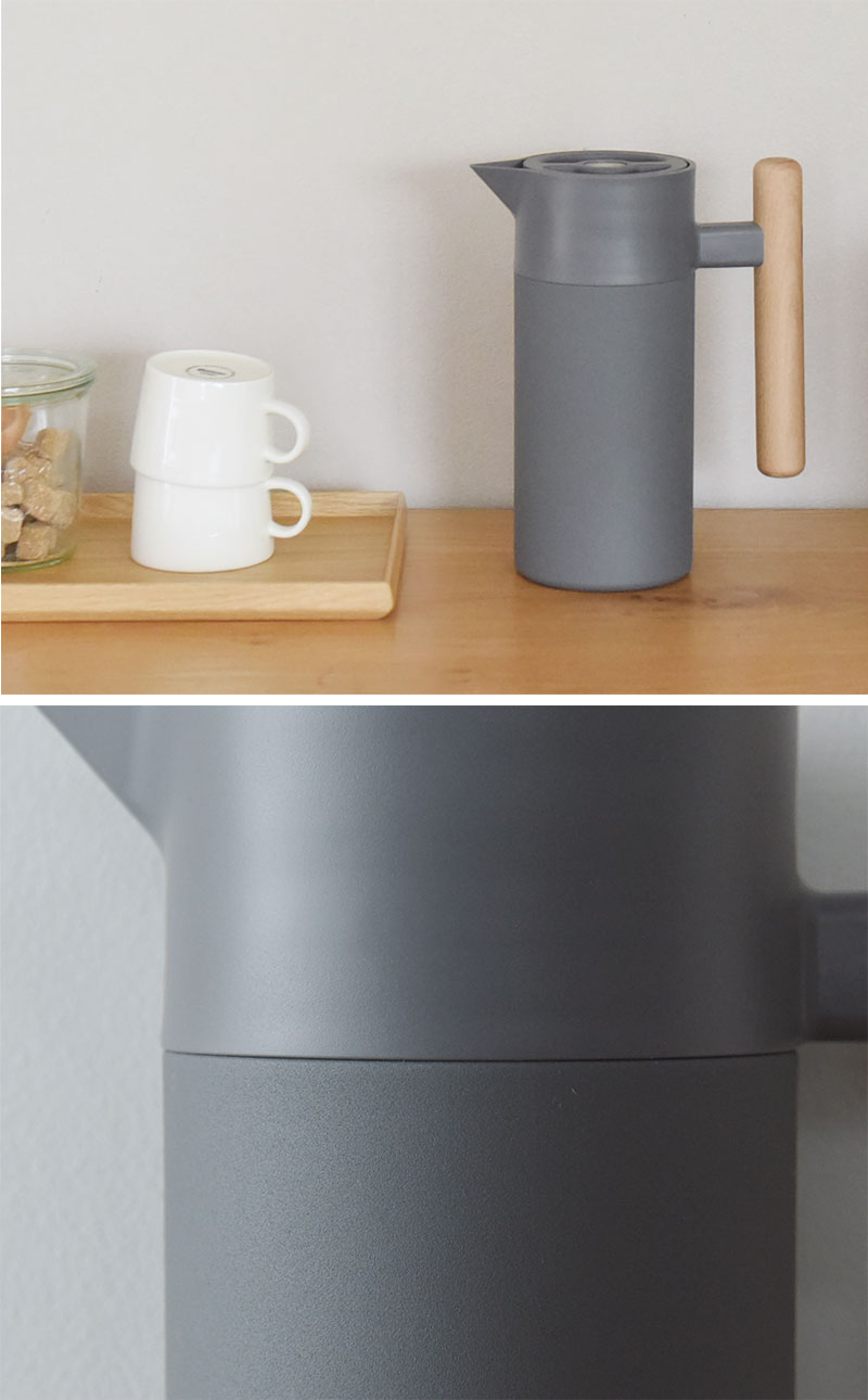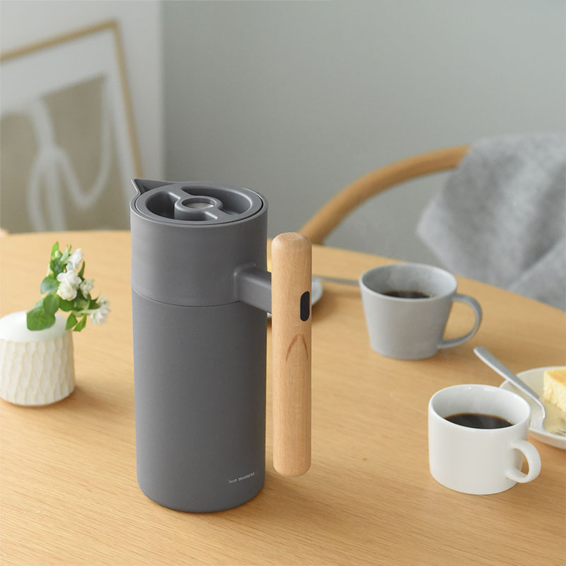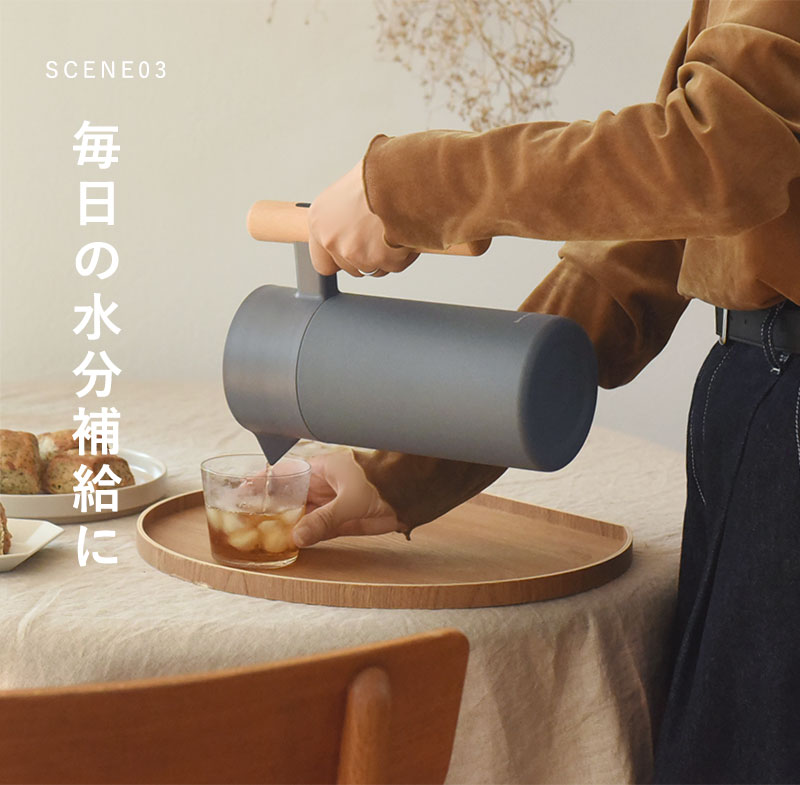 リビングに置いたままでもインテリアに馴染む、すっきりとした佇まいの保温保冷ポット。本体はマットなカラーでハンドルには天然木(ケヤキ)を使用、ナチュラルな風合いに仕上げています。