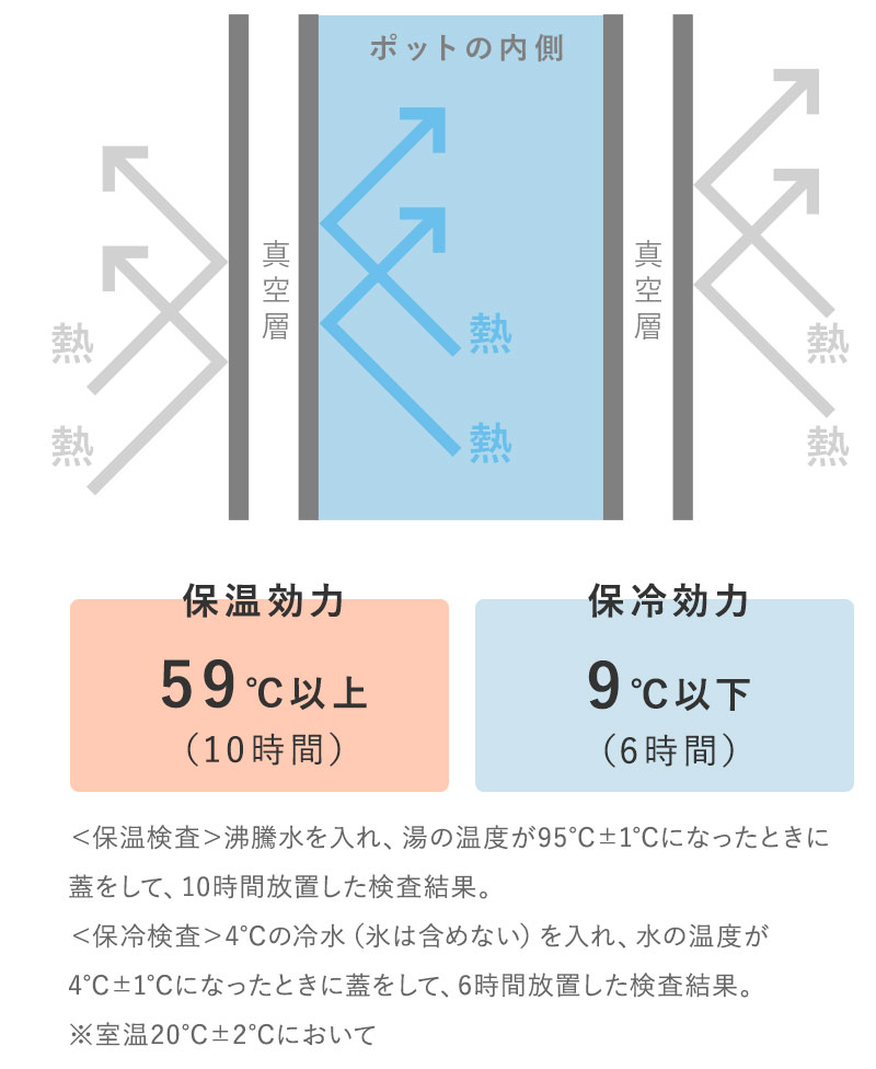 長時間温度をキープできる理由は「真空二重構造」になっているから。こまめにお湯を沸かす必要もないので電気代の節約にも。