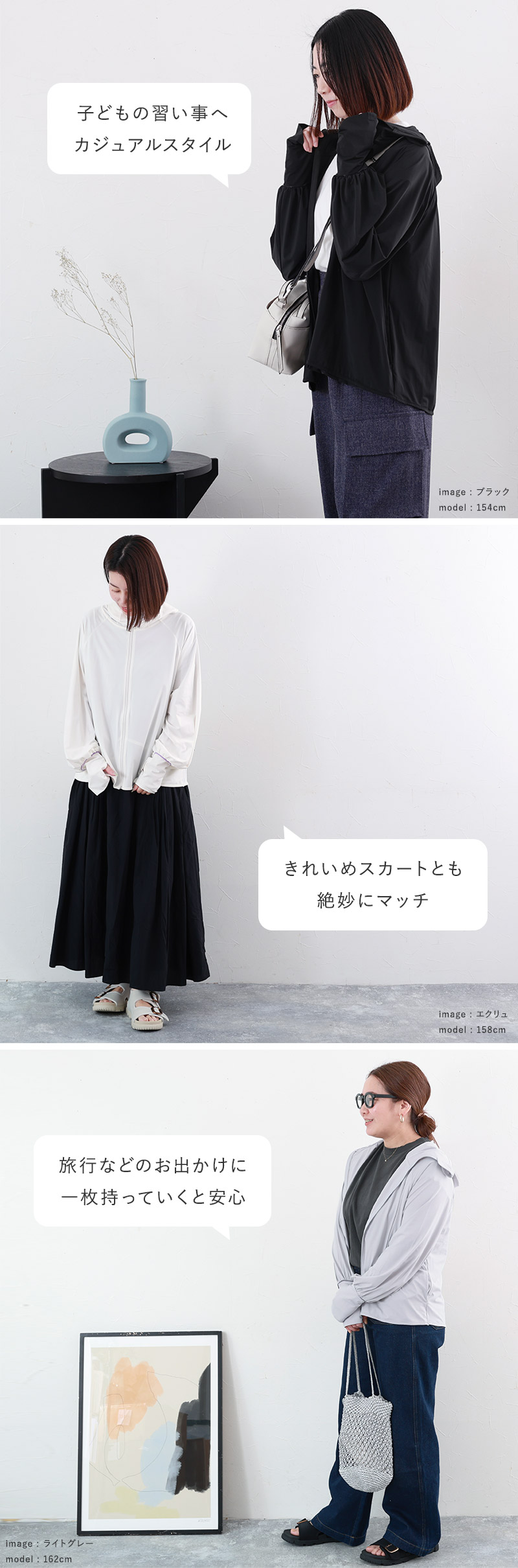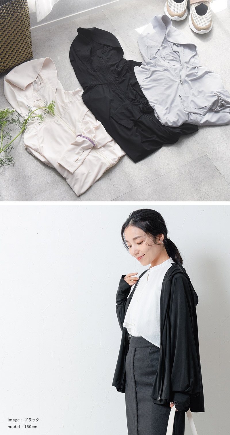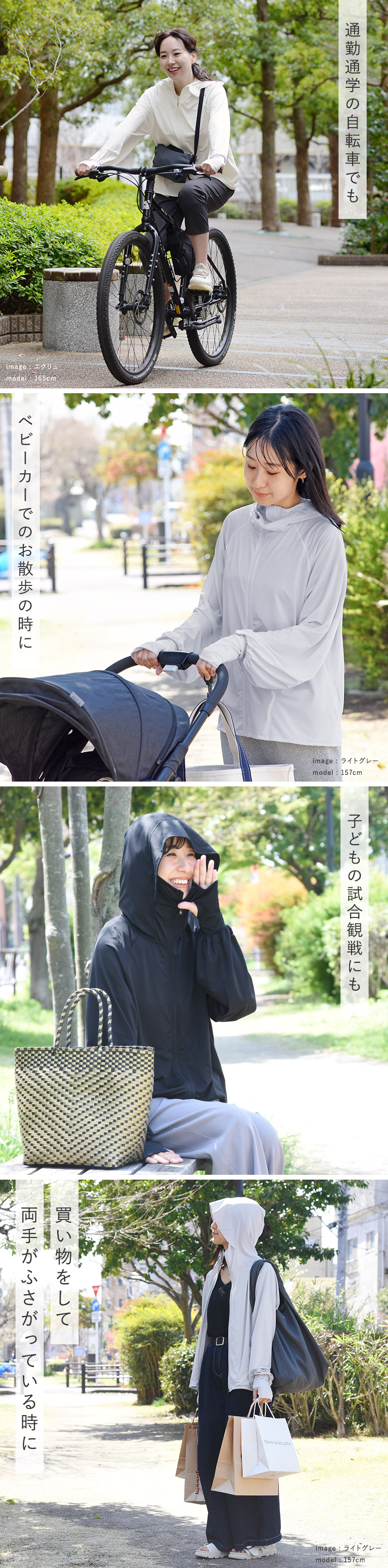 自転車や車の運転、ベビーカーでのお散歩、人が多く日傘がさせない街中にも◎。「ゼッタイ焼きたくない!」そんな方にピッタリの一着です。