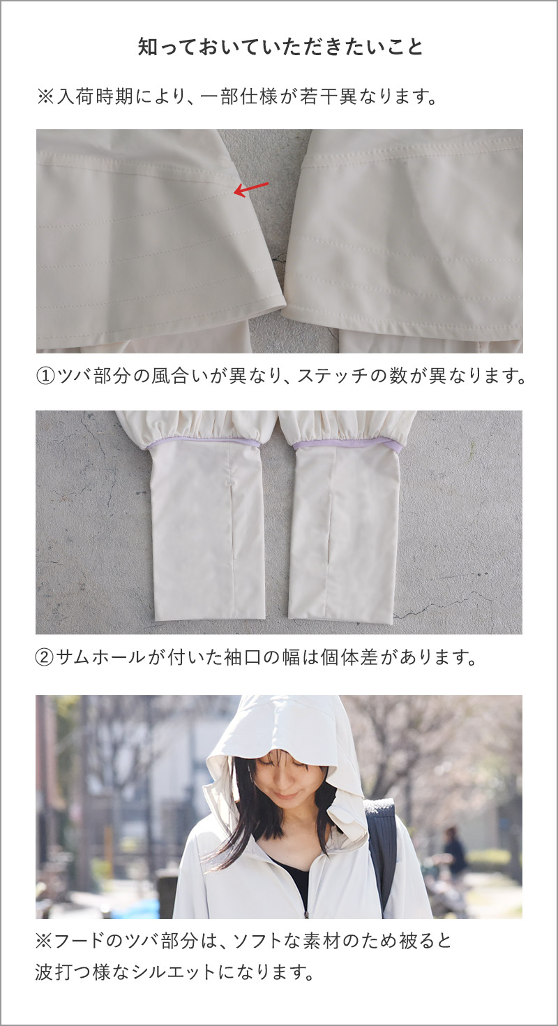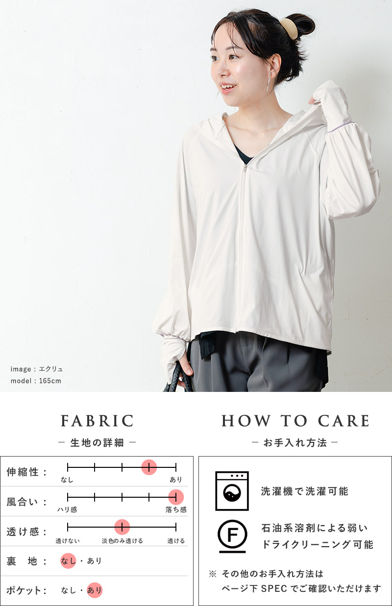 しっかりUVケアをするとなると、帽子にネックシェード、アームカバーに日傘など沢山のアイテムが必要になりますが、このパーカーなら一枚ですべてが完結。気軽にきっちり紫外線対策ができます。