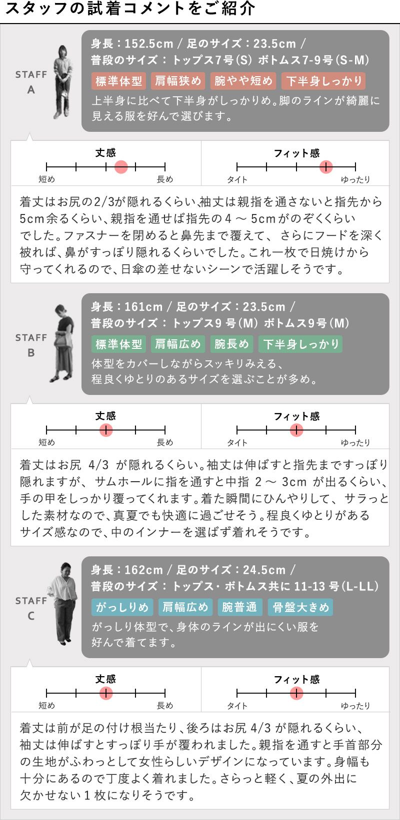 スタッフ3名が普段のコーデに合わせてみることに。カジュアルスタイルにはもちろん、ほんのりキレイめなスカートともマッチしました。デイリー使いはもちろん旅行、レジャーにも頼れる一着です。