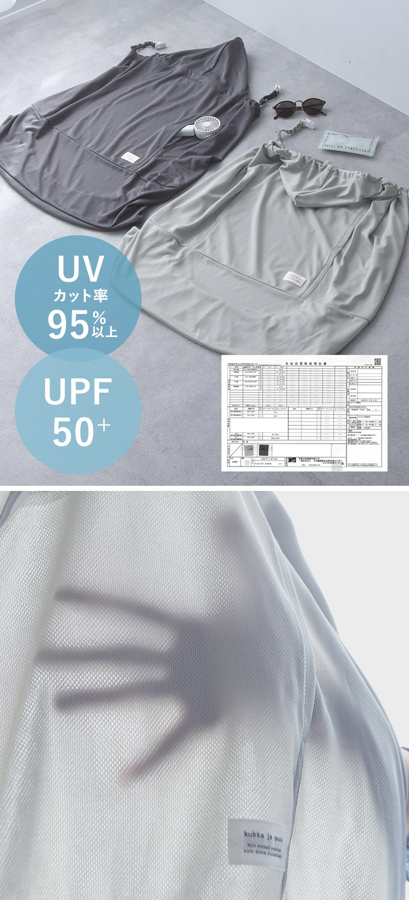 紫外線カット率95%以上、UPF50+という高機能素材のこちらは、ハンディファンを入れるポケットや保冷剤ポケットが付いた夏仕様。