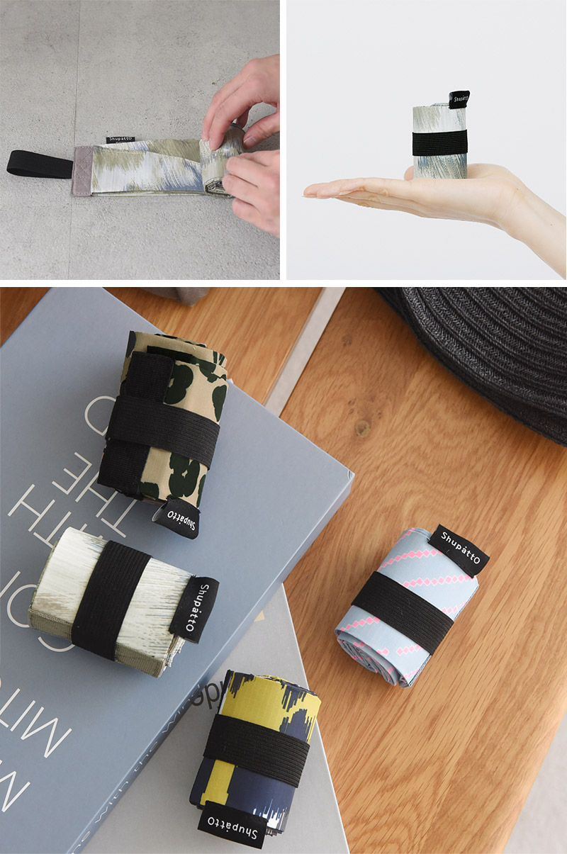 あとはクルクル巻いてゴムバンドで留めるだけ。約8秒ですっきり片付いて、たたむのが楽しみになるようなバッグです。