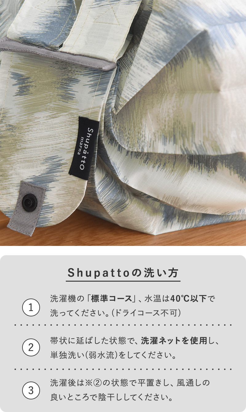 バッグとして使える強度と、たたんだ時のコンパクトさを両立した素材です。お手入れは洗濯機で丸洗いもOK。気軽に洗って清潔に保てるから、食品を入れるのにも安心です。