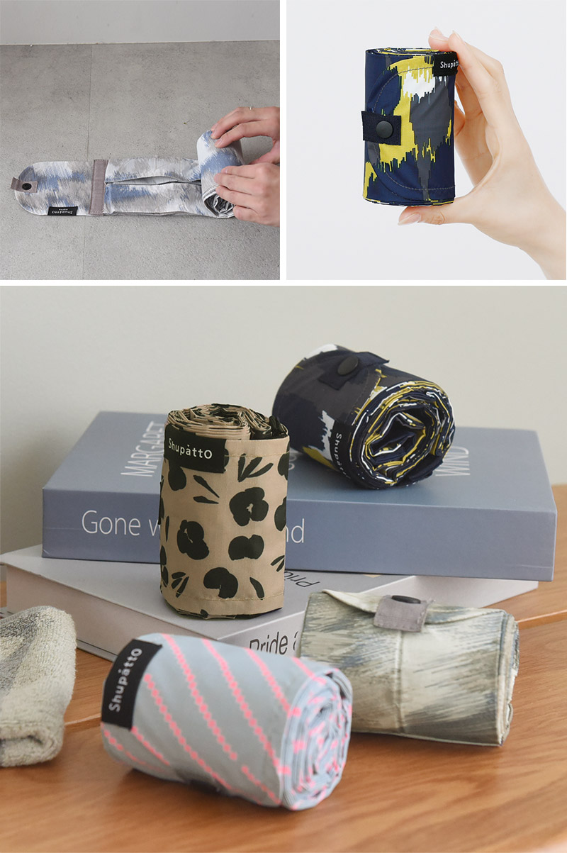 あとはクルクル巻いてゴムバンドで留めるだけ。約8秒ですっきり片付いて、たたむのが楽しみになるようなバッグです。