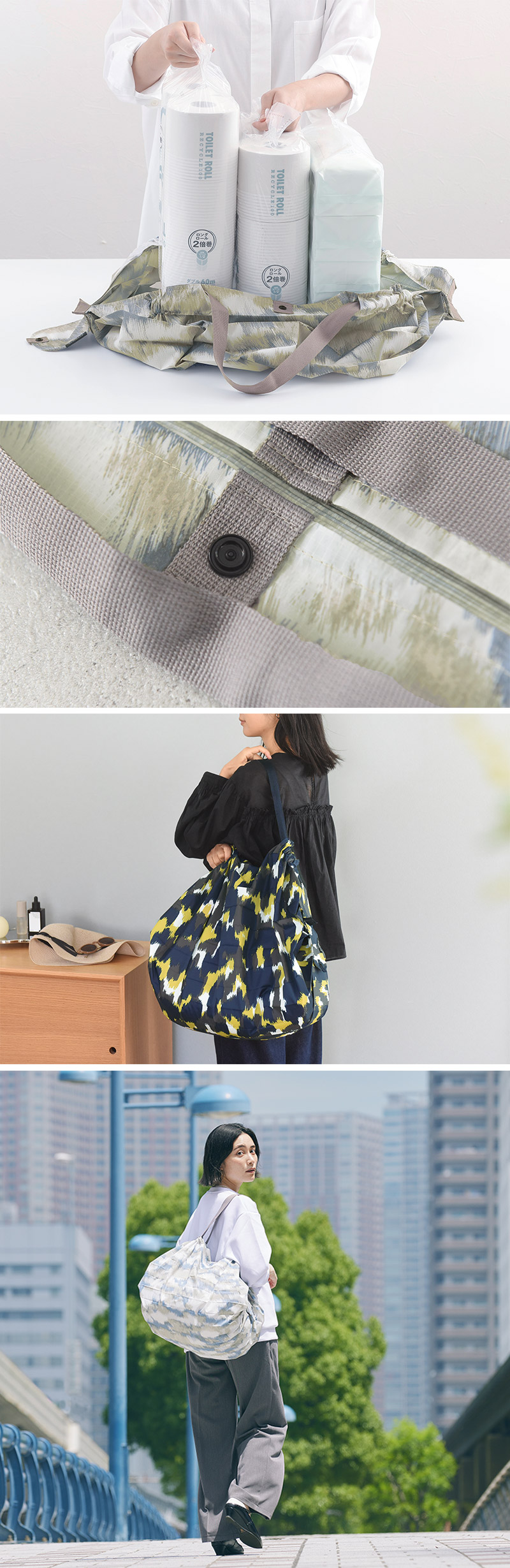 たっぷり入れても中身がこぼれにくいように、袋口にボタンが付いているのもポイント。持ち手も肩に掛けられる長さで、荷物の持ち運びもストレスフリーです。