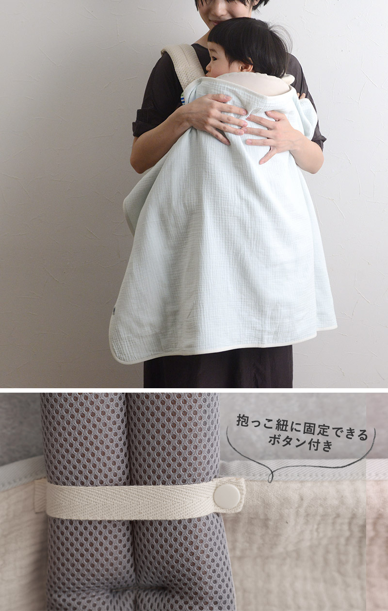 ブランケット上部2か所にボタンが付いており、抱っこ紐の肩ベルトに固定することができます。クリップなどがなくても、ズレ落ちずにご使用いただけます。