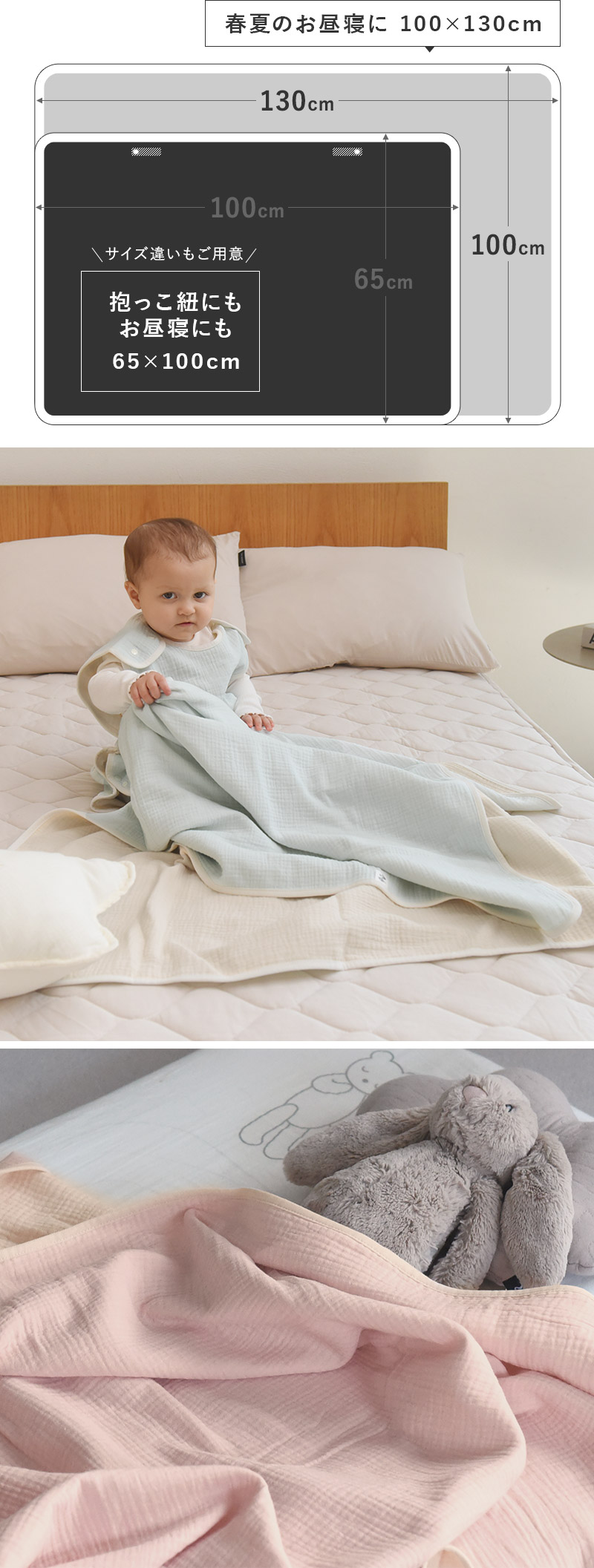 ぽかぽか春の昼下がりや、寝冷えが気になる夏場のお昼寝に。ふんわり優しくベビー&キッズを包み込む、4重ガーゼブランケット(130×100cm)です。