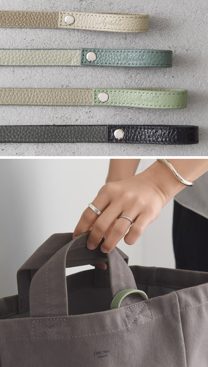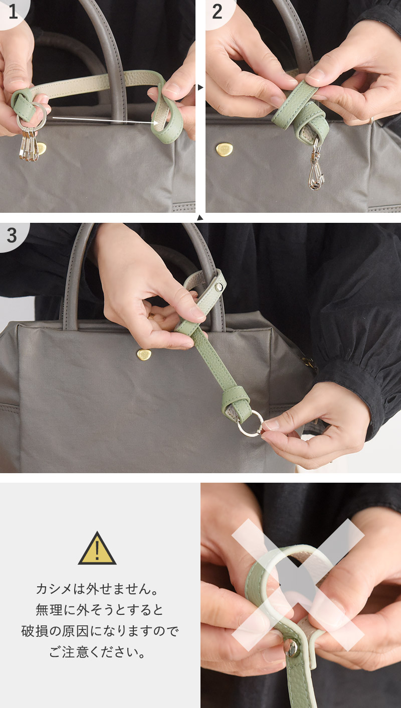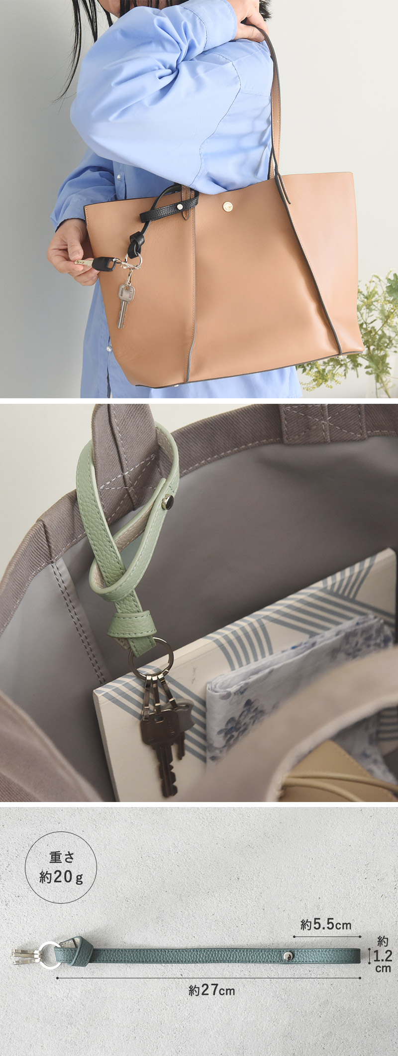 そんな鍵の大捜索を卒業できる、キーストラップが登場しました。バッグの持ち手にくるっと付けるだけ、鍵の定位置が決定。使いたい時にサッと取り出せるから、玄関前でモタつくこともありません。