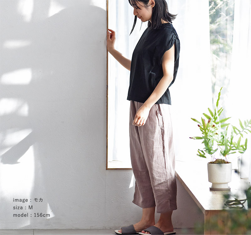 軽やかなガーゼ素材は、ほんのり透け感はありますが、2重ガーゼであることで、1枚で着ても安心感◎。