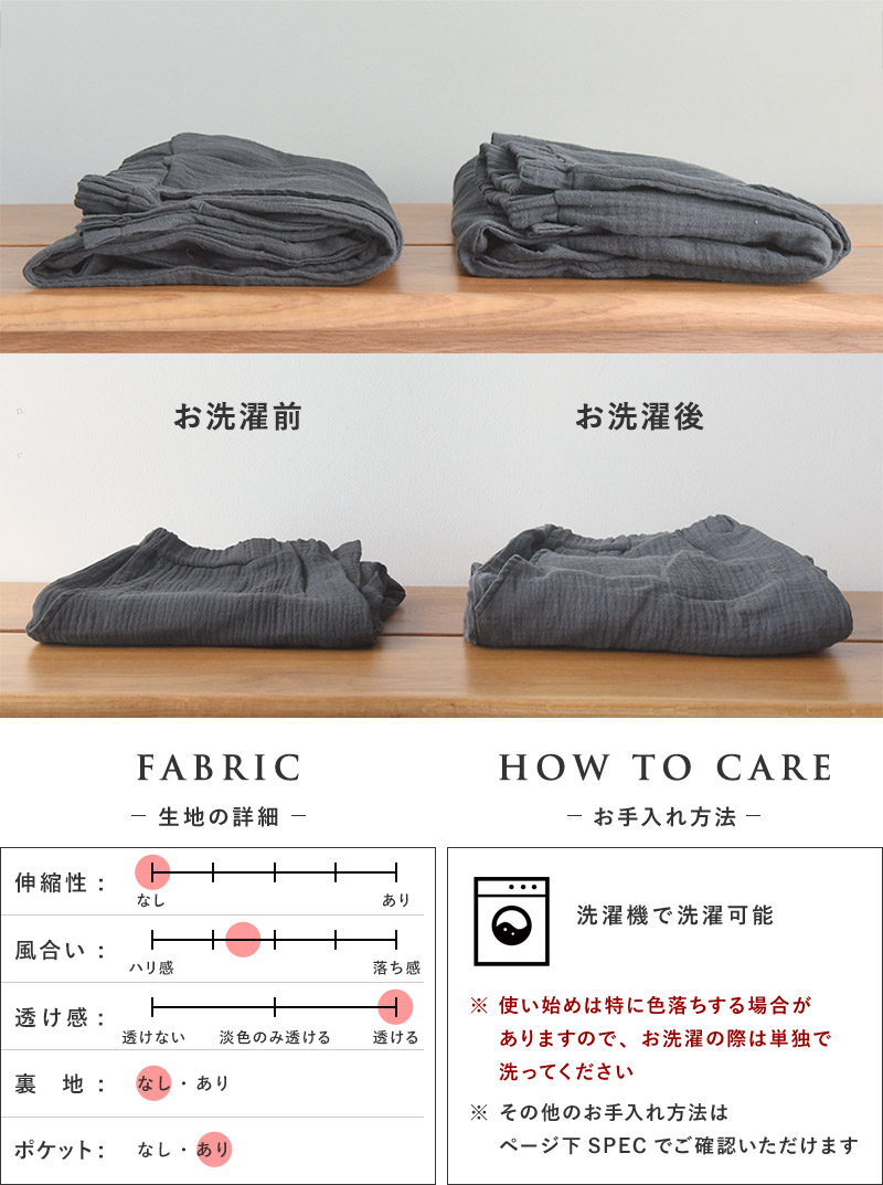 ガーゼ素材は使い込むほどに育つ素材。最初はややハリ感がありますが、洗濯を繰り返していくうちに柔らかくなっていきます。