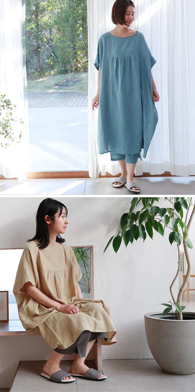 コットン100%の2重ガーゼ素材を使った、サラサラふんわり、素肌にやさしいリラックスウェア。吸水性・通気性も抜群で、すぐ乾いてくれるのも魅力です。