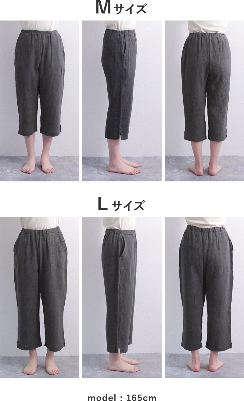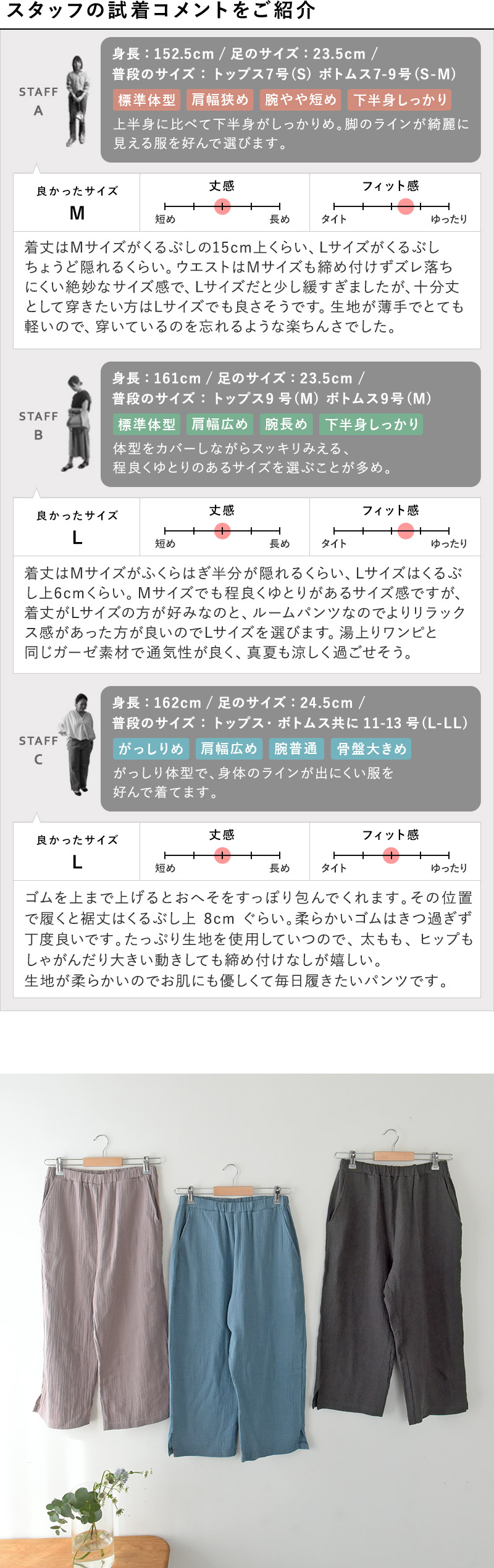 締め付け感ゼロで、脚にまとわりつかないから、お風呂上りからおやすみタイムまでずーっと快適。湯上りワンピとセット使いもできて、ルームウェアとしてもパジャマとしても活躍してくれます。