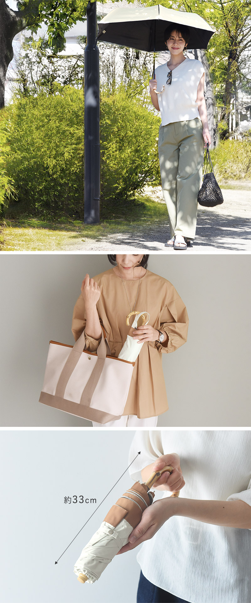 • 晴雨兼は小さめで、朝晴れて帰り雨なんて天気予報の時に悩んでいましたが、生地もしっかりしているので雨の日も大きさといい大丈夫そうなので梅雨の時期に活躍しそうです。バンブーの持ち手も上品で好きです。