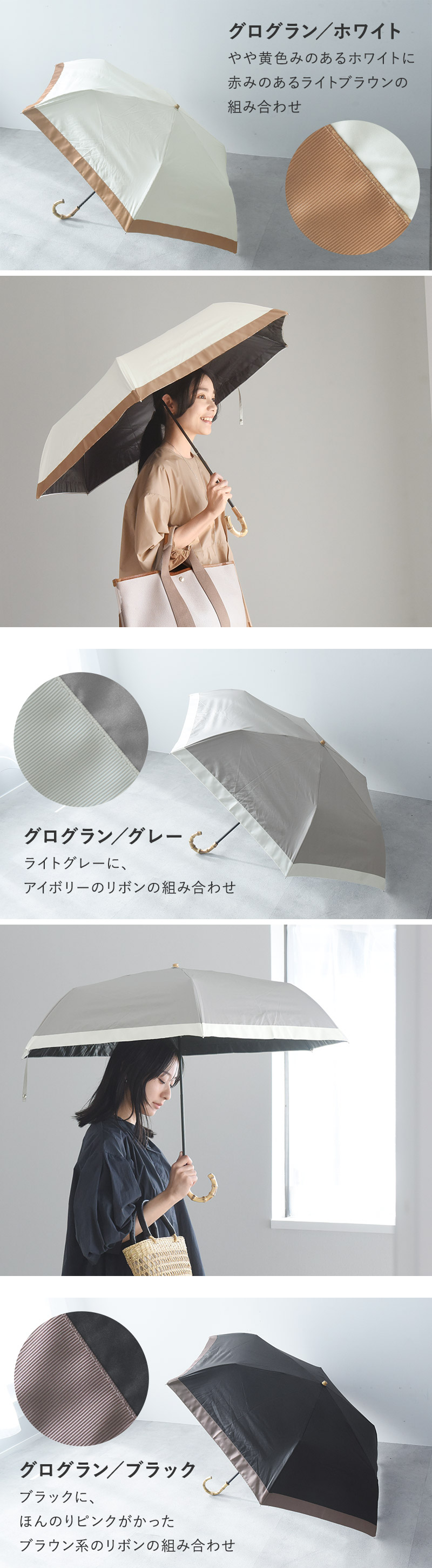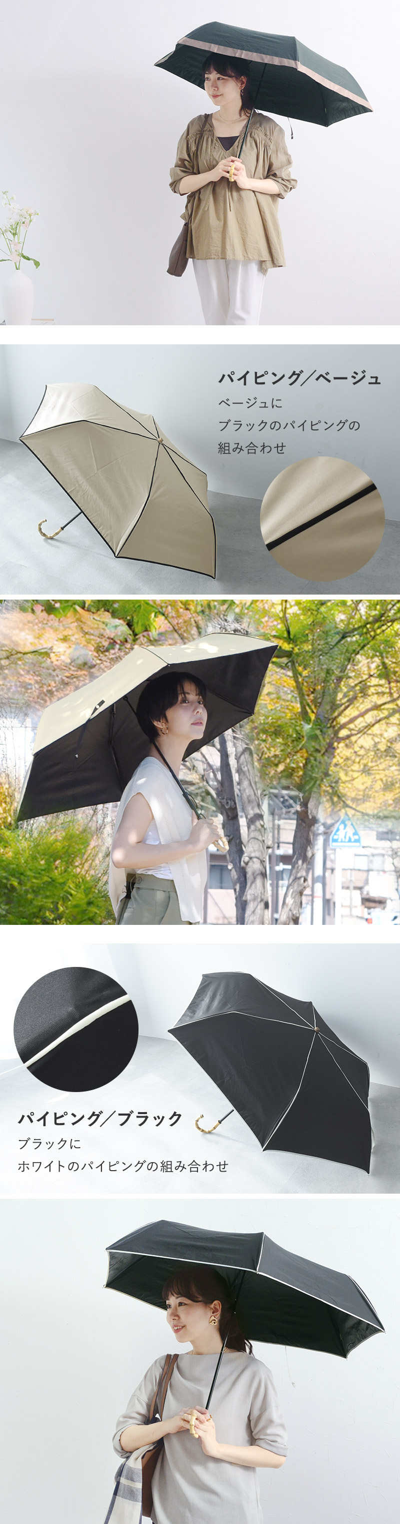 バンブーハンドルが上品な印象の日傘。UVカット率100%など強い日差しもしっかりとガードしてくれます。グログランデザインとパイピングデザインの2種類をご用意。