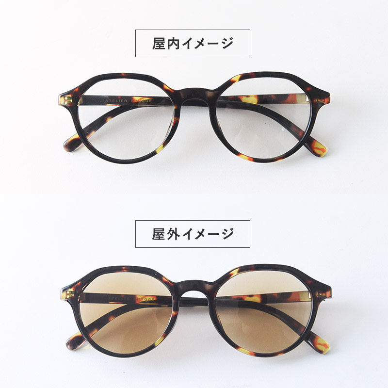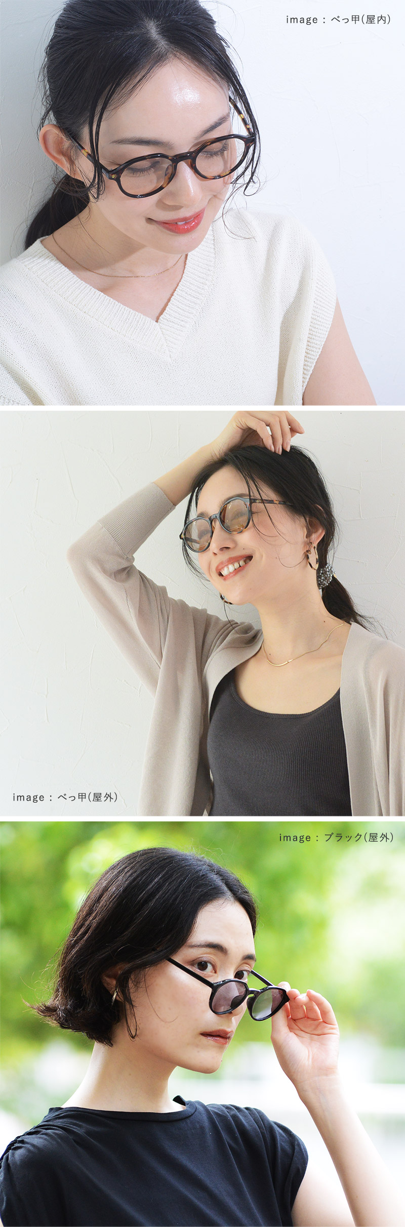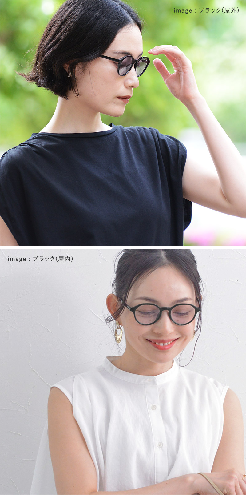 紫外線が当たらない場所ではクリアなレンズですが、外で紫外線が当たるとカラーレンズに変化。サングラス&伊達メガネ、2通りの楽しみ方ができます。色が自然に調整されるので、屋内でも屋外でもつけっぱなしで過ごせるのも◎。