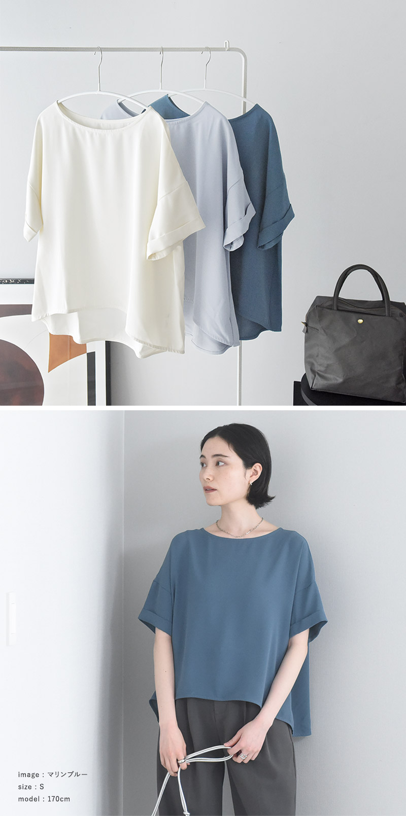 顔周りすっきり、上品ボート風ネックボートネックとラウンドネックの中間くらいの、開き過ぎず詰まり過ぎないネックデザイン。顔周りをすっきりと見せながら、品のある涼やかさを演出してくれます。