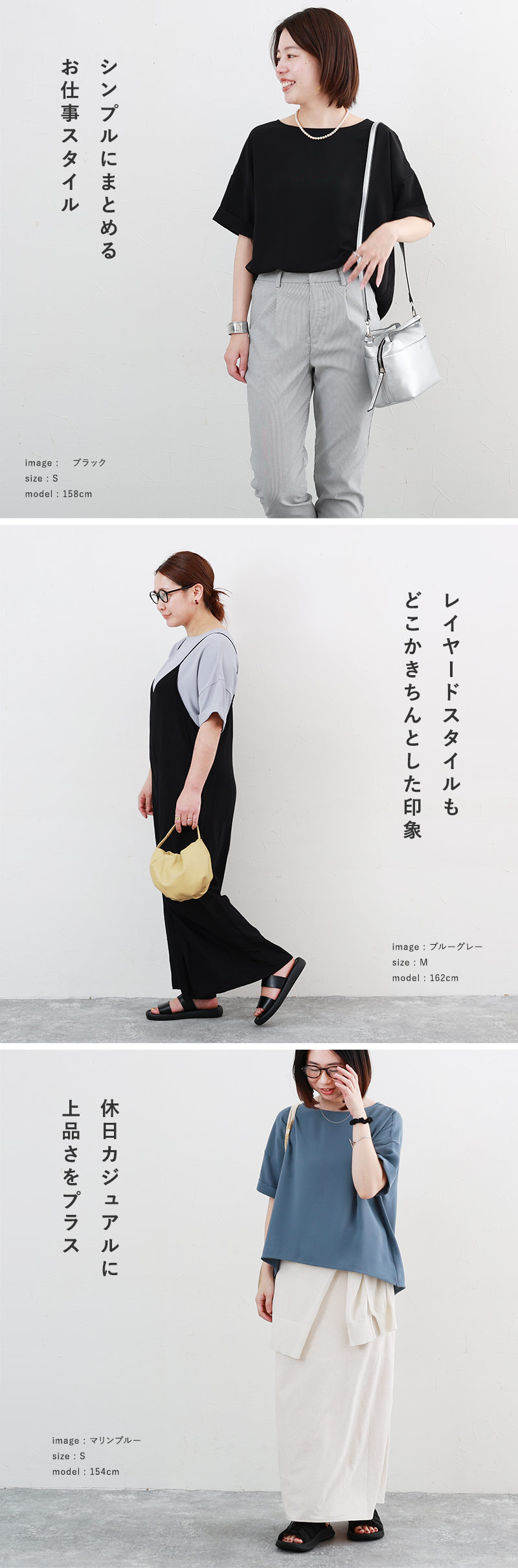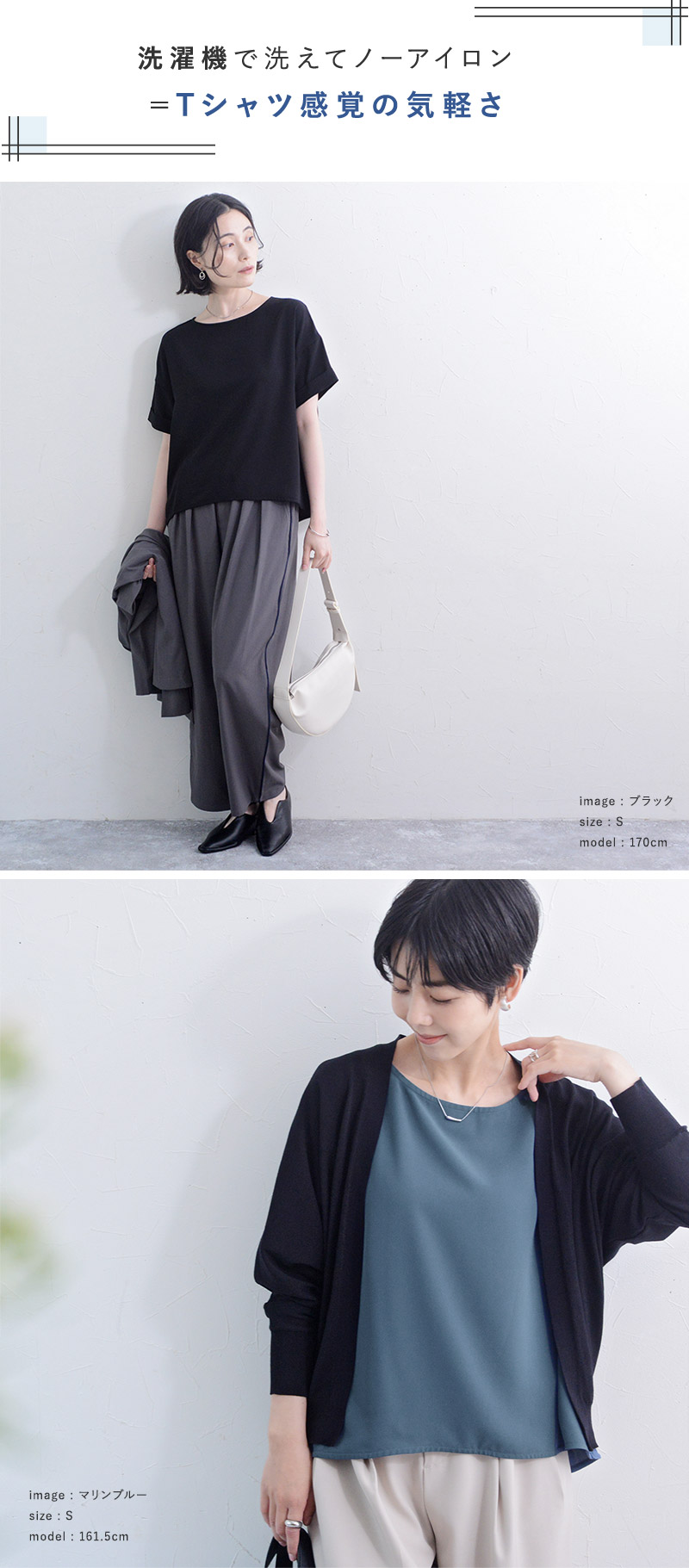 ひんやり接触冷感や吸水速乾機能はそのままに、ゆるりと着られるシルエットや二の腕カバー袖で、ますます気の利くデザインに。お仕事からカジュアル休日まで、今年も大活躍の1枚です。
