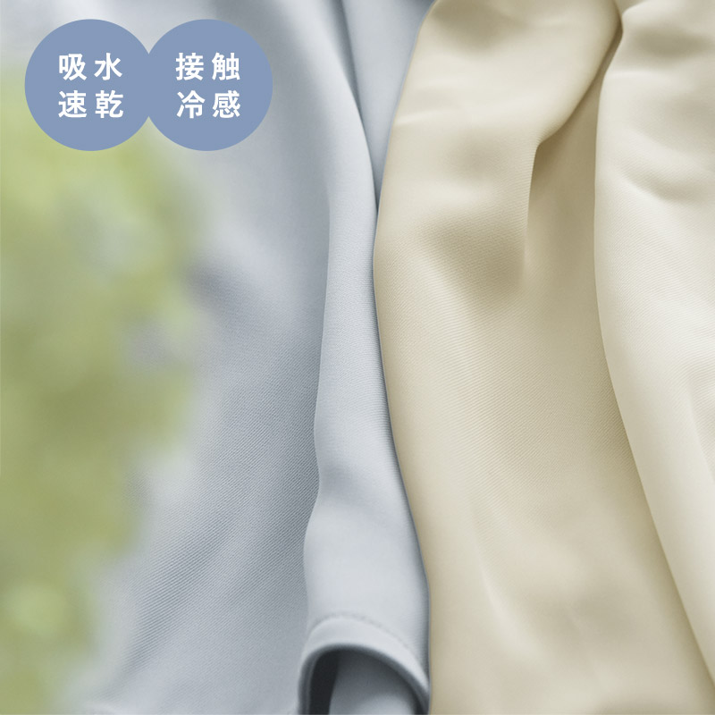 1枚で着ても様になるような、程よい厚さの生地。汗ばむ季節に嬉しい「接触冷感」と「吸水速乾」機能のある生地は、ひんやりサラサラ、汗をかいた後もお洗濯後も乾きやすく、デイリー使いにぴったりです。