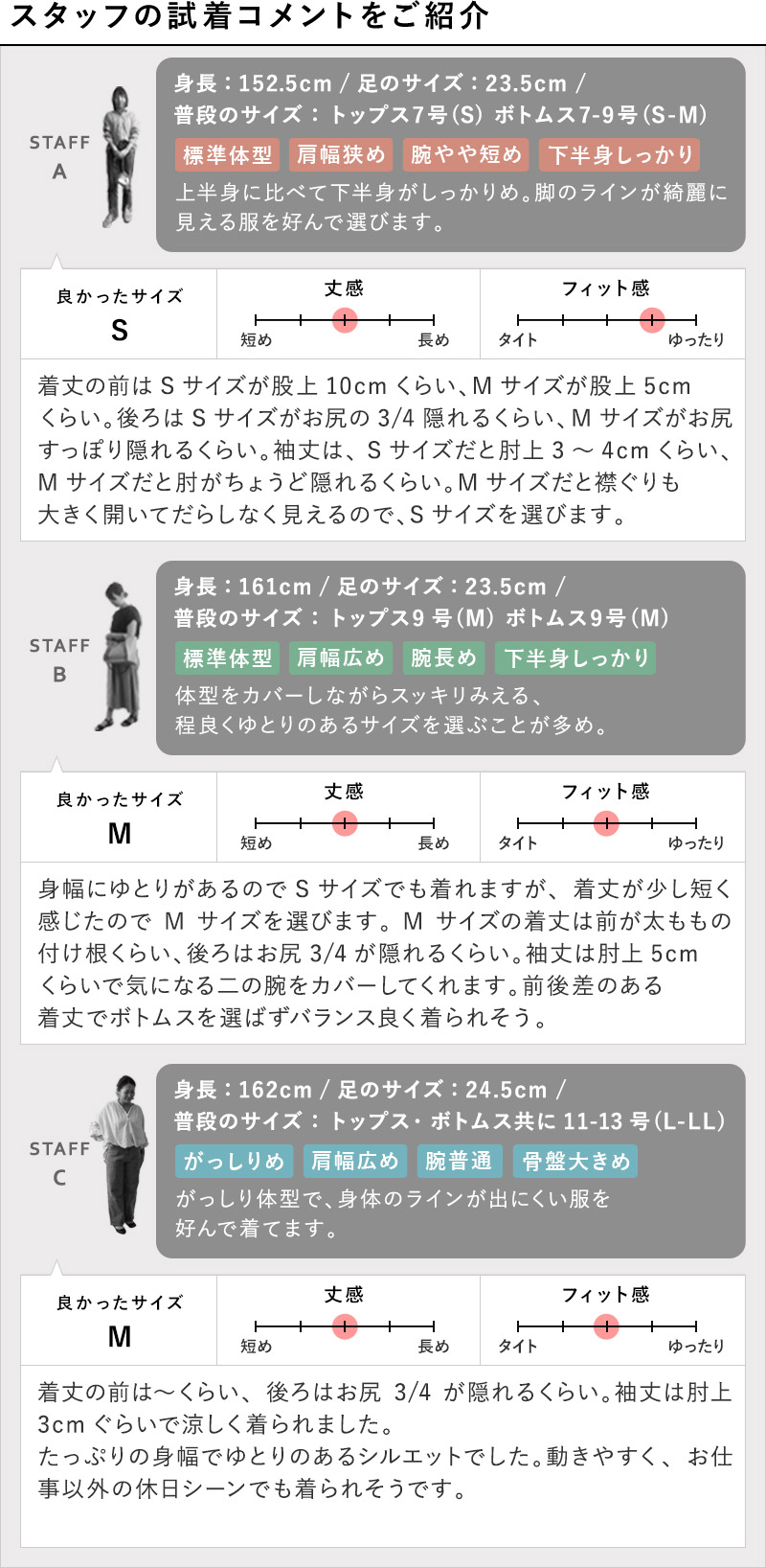ゆったり身幅身体のラインを拾わないゆったりめのシルエットは、見た目にも涼し気です。