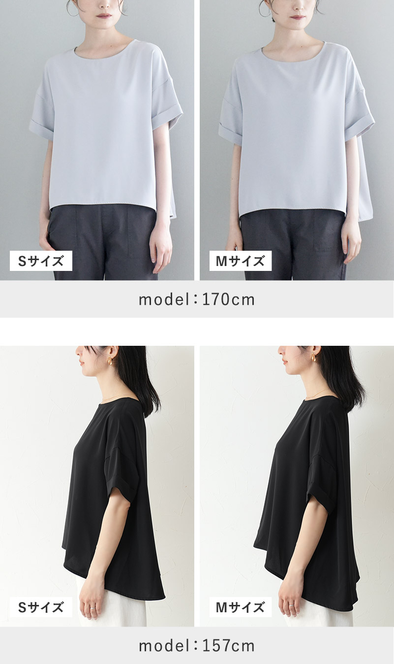 さり気なく二の腕を隠せる袖丈に、袖口の折り返しデザインが視線そらしに。汗ばむ季節に着たいからこそ、一枚で着ても安心感のあるデザインにアップデートしました。
