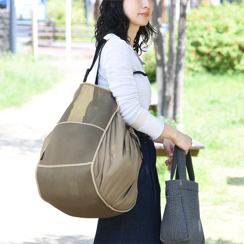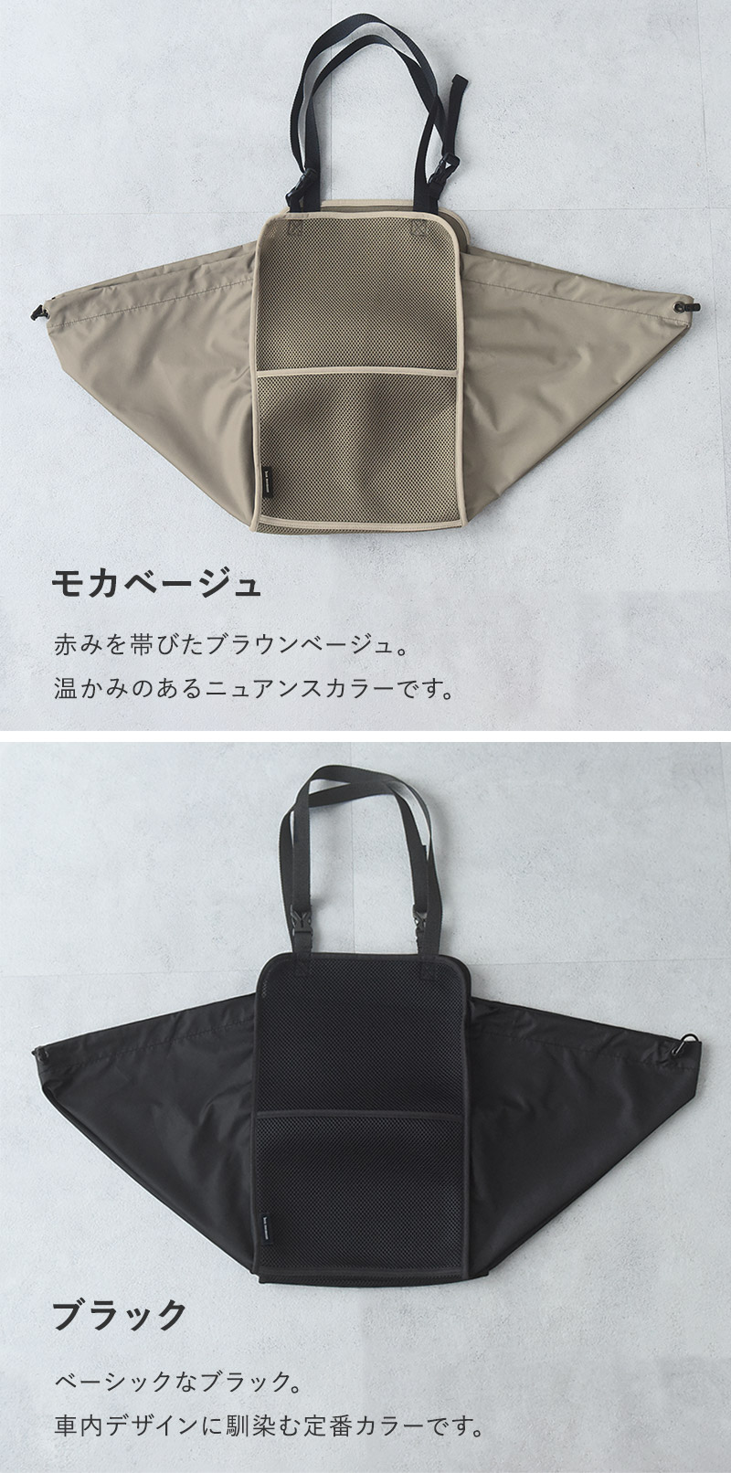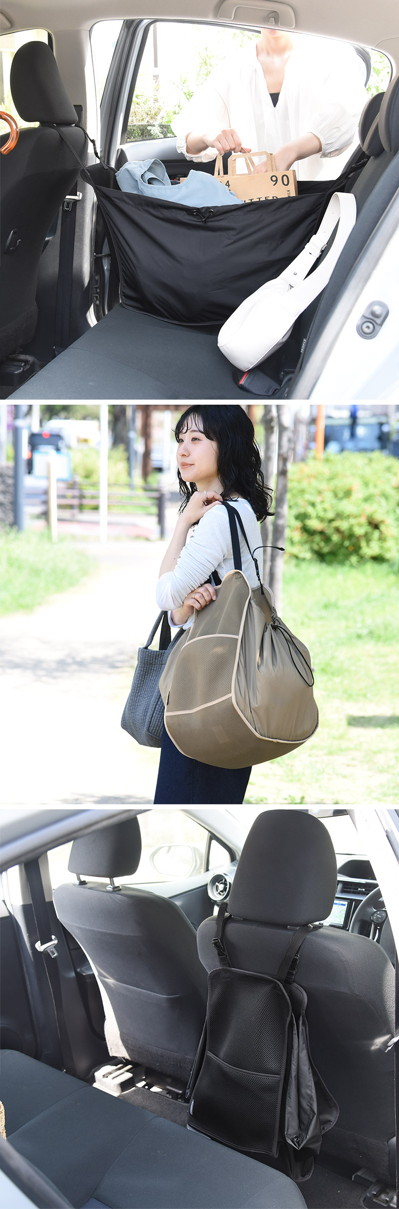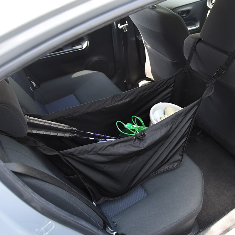 - 車であちこち買い物をした時に、荷物をまとめてガサっと入れておけるハンモック型の収納トートが登場。トートタイプなので、車から降りるときはそのままサッと持ち運べます。