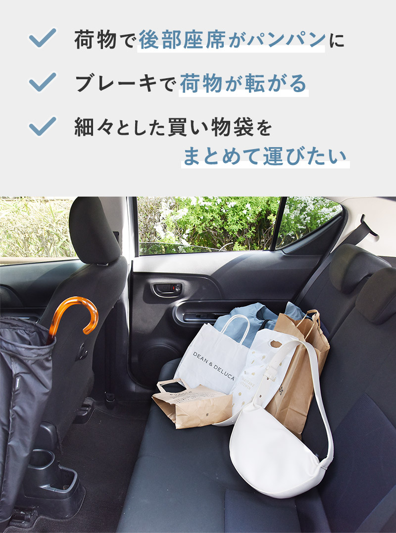 車であちこち買い回りをした時に、プチストレスになる荷物の置き場。後部座席にドサッと置くとそれだけで座席が埋まったり、ブレーキを踏んだ瞬間、前に転がってしまうことも。