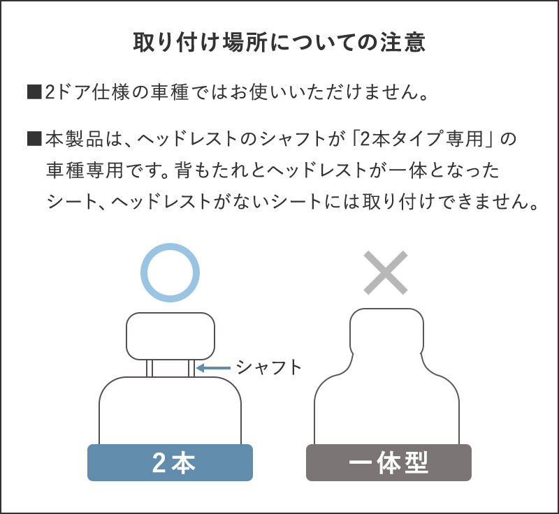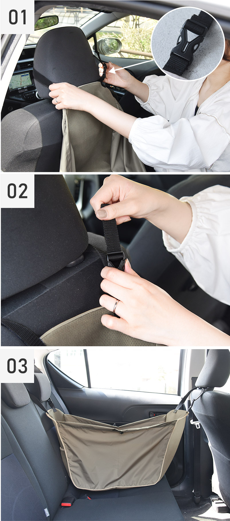 1.前席と後席のヘッドレストに、上からベルトをひっかけるか、バックルを外してベルトを通します。