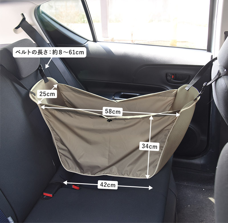 買ったものをポンポン収納前の座席と後部座席のヘッドレストに引っ掛けるだけで設置完了。買ったものをどんどん入れれば車内がすっきり。ブレーキをかけた時に荷物が転がるのも防ぎます。